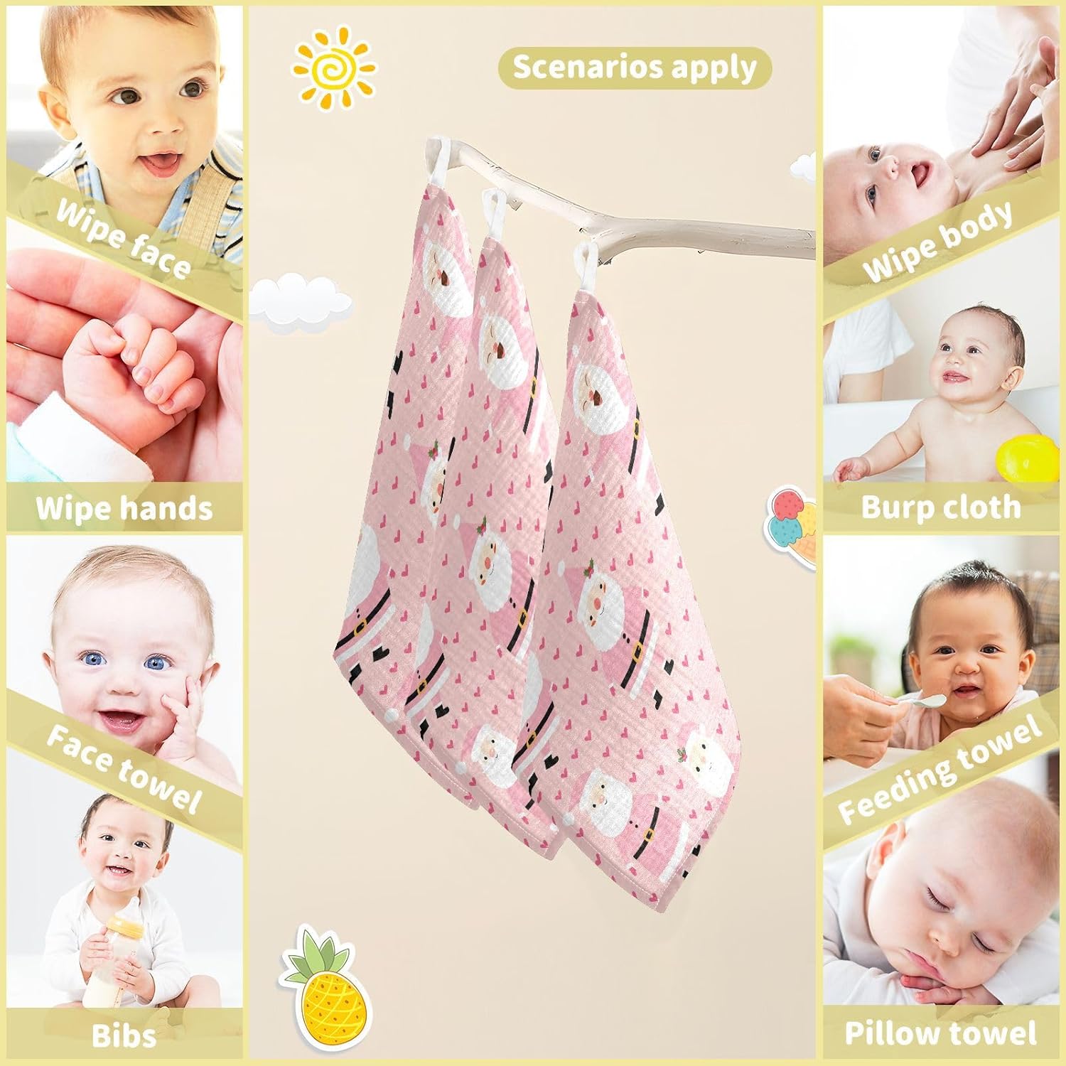 Pink Christmas Santa Claus Muslin Burp Cloths Baby Burp Cloths for Boys Girls Cute Hearts Baby Muslin Washcloths Baby Essentials for Newborn Soft Absorbent 12x12in,3 Pack