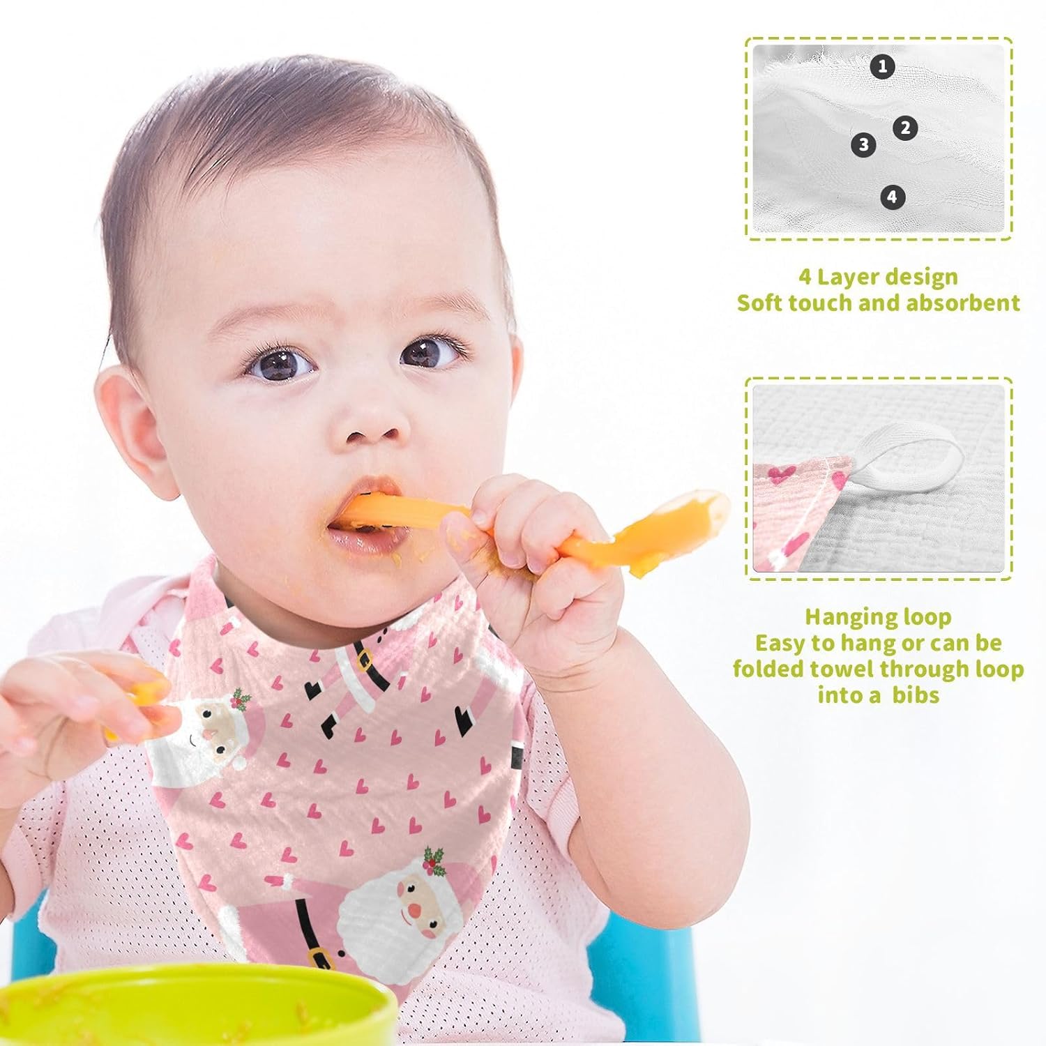 - Multiple Uses: The square towel can be folded into a triangle, and one corner of the webbing is passed through, which can be used as a saliva towel. They also can be used as breastfeeding cover ups, baby changing mat covers, face towels, bibs, spit rags, burp cloths, kitchen dish towels, spit up cloths, sweat cloths, hand towels, bath towels, teething cloths and even as makeup cloths.