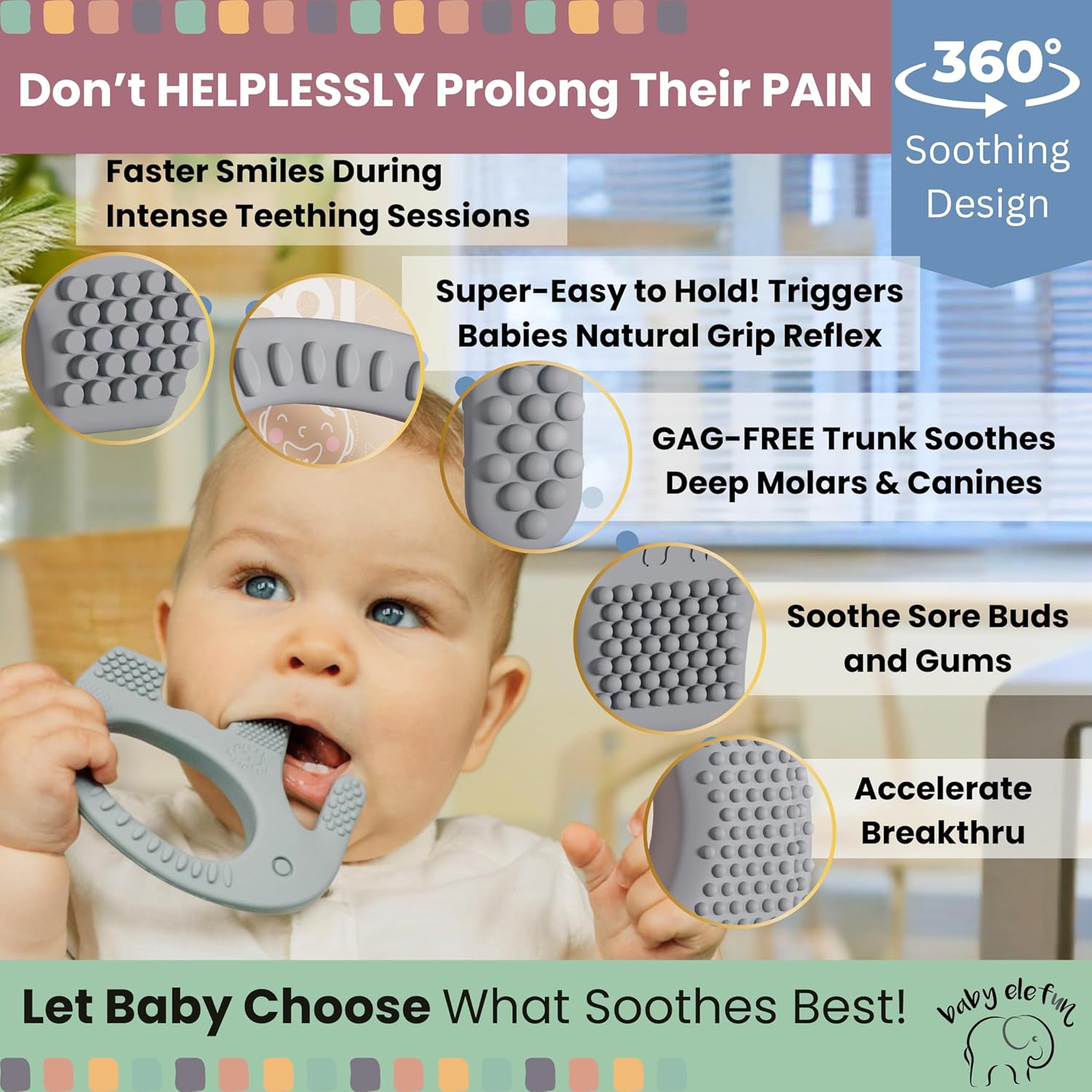 - 5X smart pain relief surfaces = mom’s not a chew toy: while other teethers for babies 6-12 months train growing baby that mom’s nipples are a chew toy - Ouch! - Elefun Pacifies baby into bliss, with 5 strategically designed teething surfaces that keep baby interested in chomping on their Best Little EleFriend and not on their parents poor hands. Nom...Nom...nom...Blisssss….
