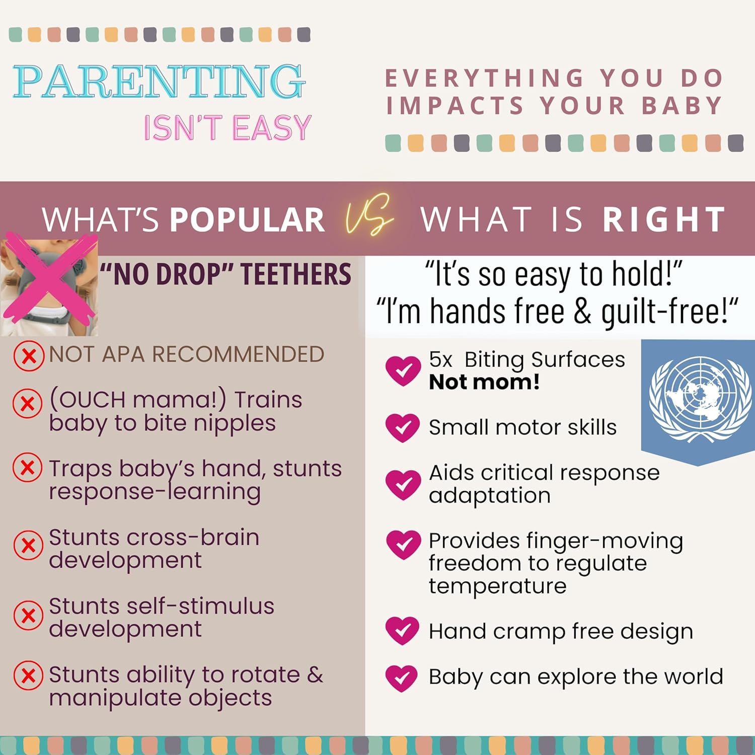- Big days ahead, baby! Big tears or big grins? Only mom or dad can decide how fast you’re soothed & more than 10,000 reviews proves these Mom Consortium Created baby teethers 6 to 12 months help every step of the way, with 5x rapid relief surfaces, multiple easy to grip angles that won’t cause baby delays like no drop teething toys, and a Pediatric Dentist Approved teething ring design. The ideal silicone teether to help baby through that ultra-drooly “Chomper Charmer” stage.