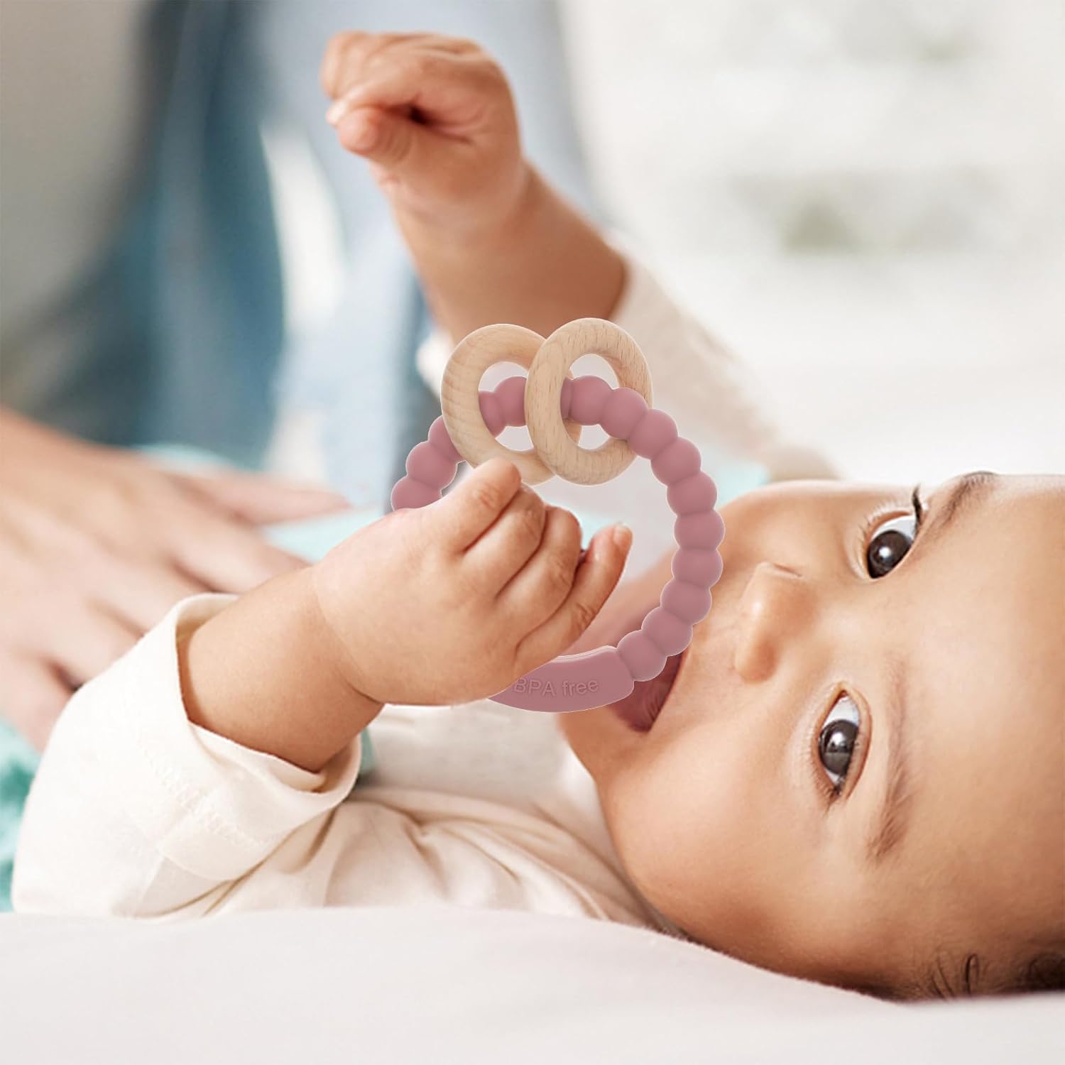 Baby Teether, One Piece Design Silicone & Beech Teething Ring Toy for Babies, BPA Free (Power Rose)