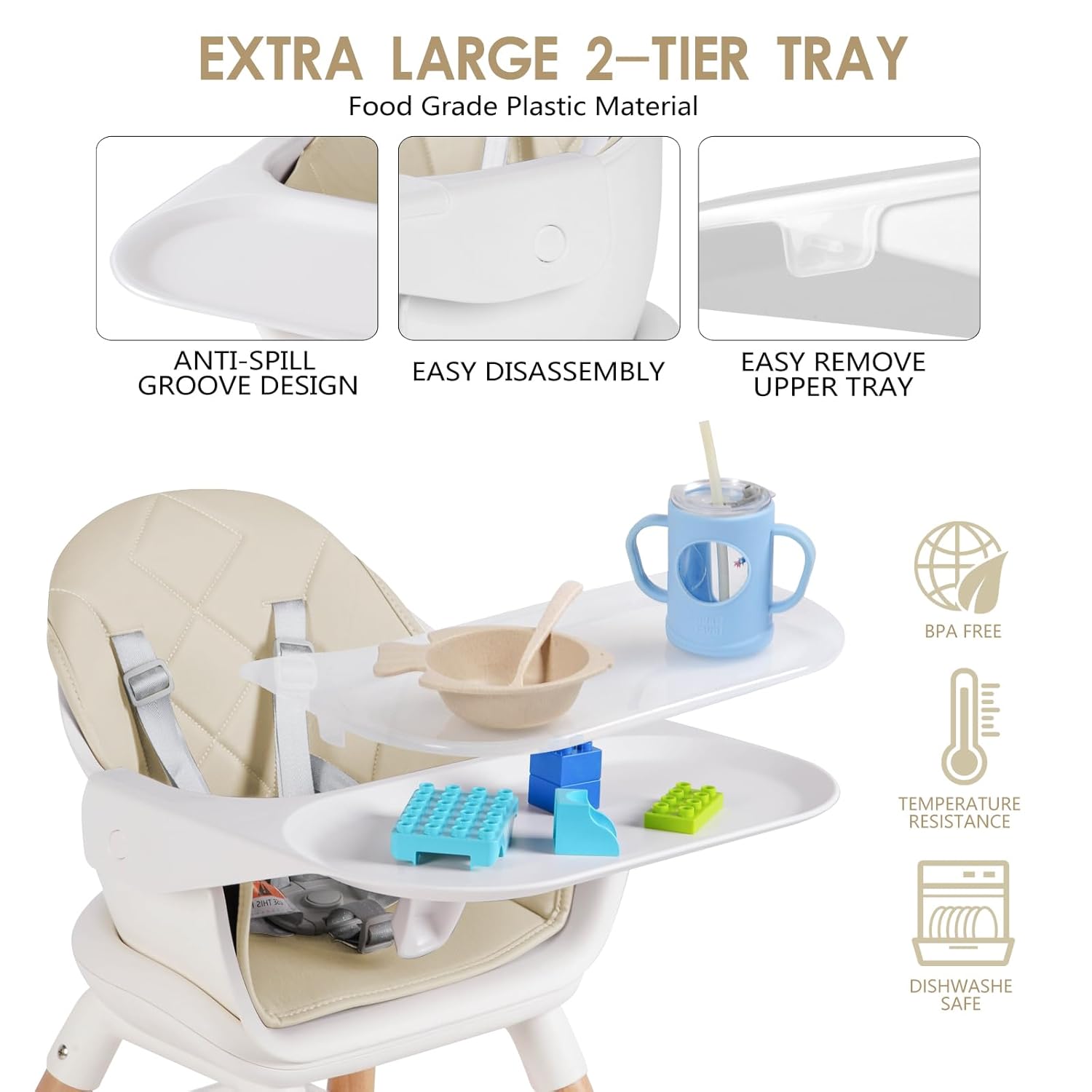 - 【High-Quality Safe Materials】This convertible infant high chair is made from food-grade PP material and smooth hardwood, safety, odor-free use, and BPA-free construction. The wooden high chair legs are crafted from premium beech wood, offering durability and a long service life. The toddler high chair’s smooth, waterproof PU seat is soft and skin-friendly, providing a comfortable experience for your baby, and is easy to clean-simply wipe with a damp cloth.