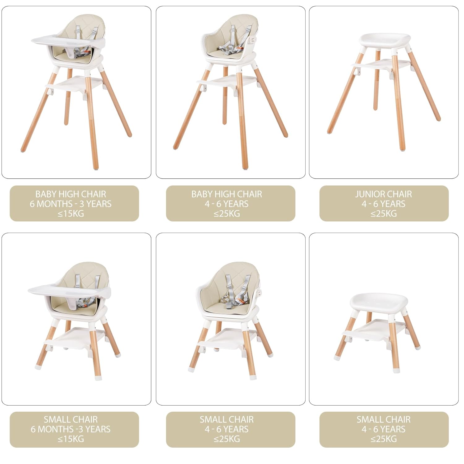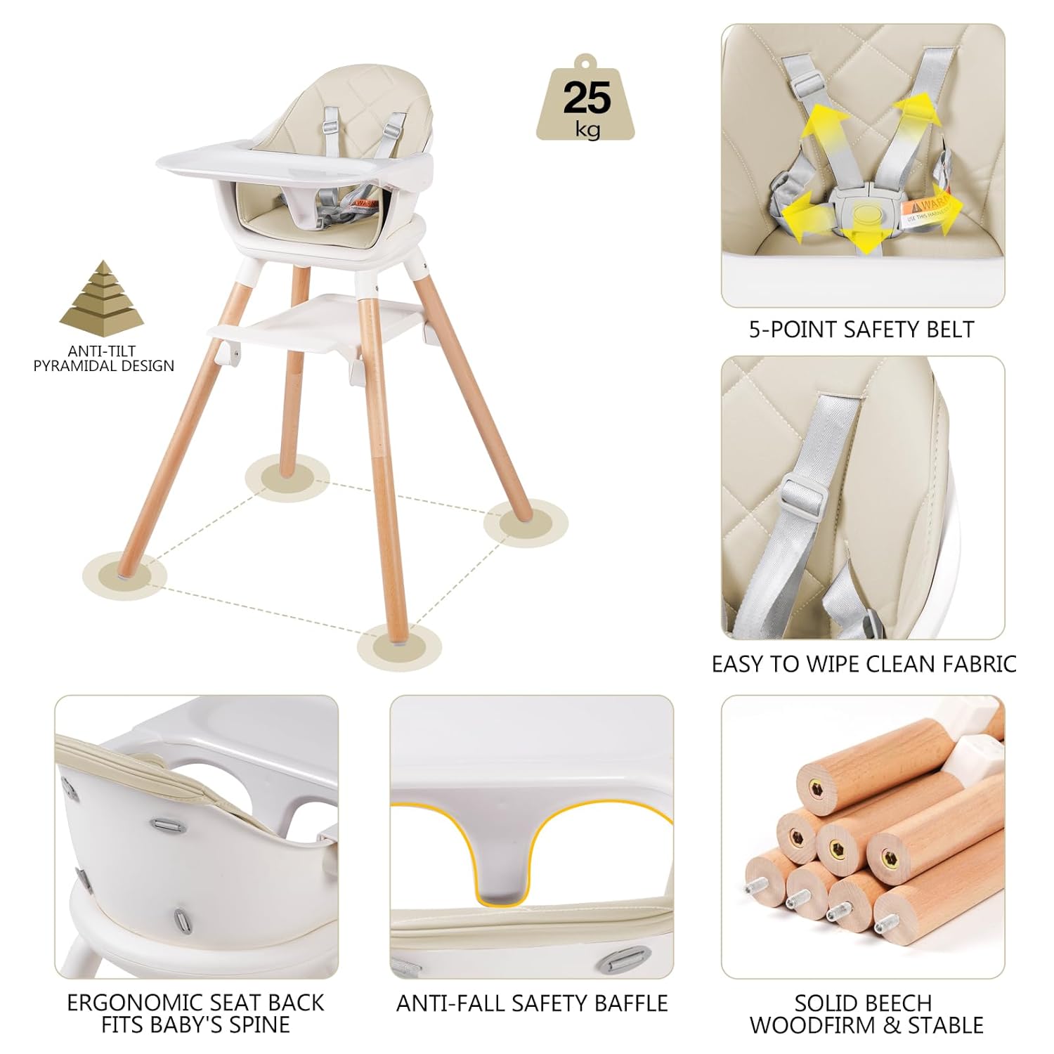 6 in 1 Baby High Chair, Convertible Wooden High Chairs/Booster Seat for Babies and Toddlers, Baby Feeding Chair with 5-Point Harness/Double Removable Tray & Adjustable Footrest (Beige)