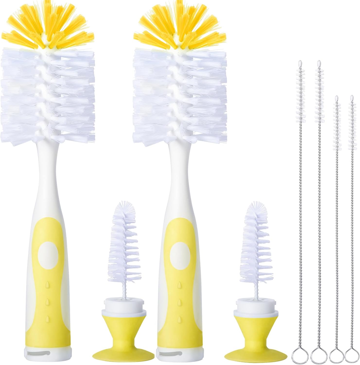 2 Pack Baby Bottle Brush with 4 Pack Straw Brushes, 10.2" Nylon Brushe with Nipple Cleaner and Stand Suction Cup, Yellow