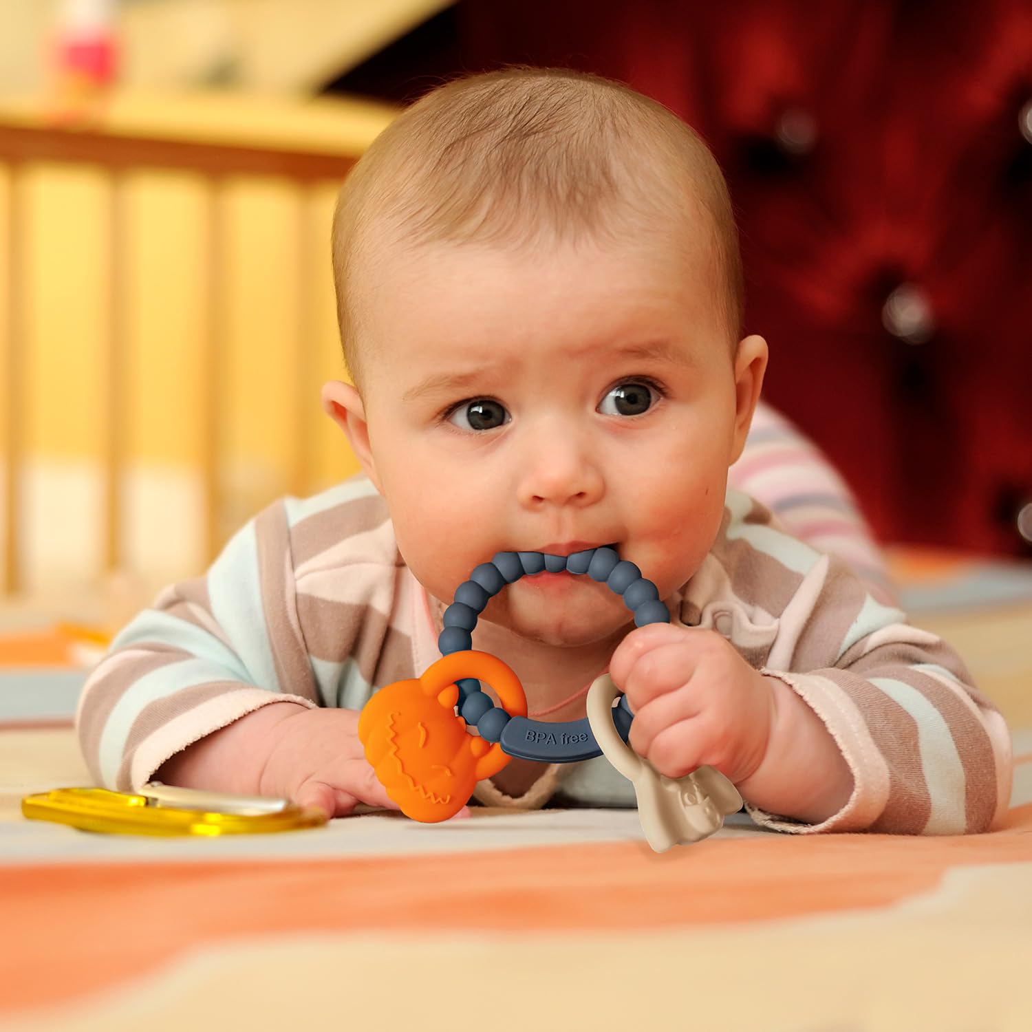 - Portable travel- Take the chew toys on-the-go with our handy silicone toy safety rope. It can be securely tied to baby strollers, car seats, cribs, and play areas, making it convenient for babies to access anytime, anywhere. No more worrying about dropping it on the floor!