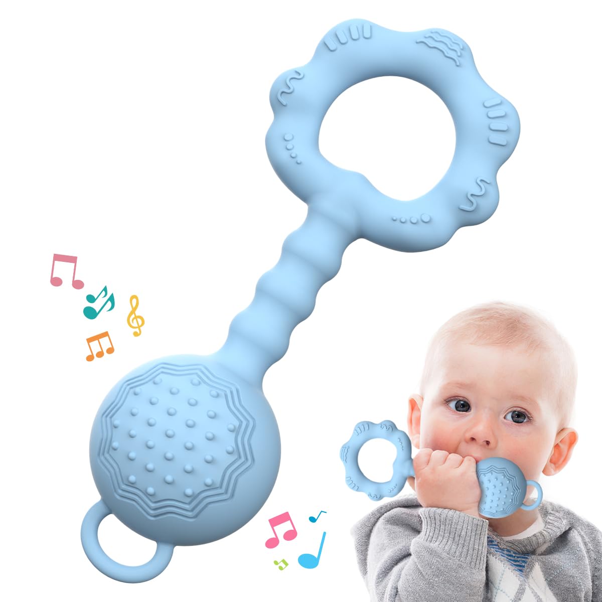 - - Relieve Teething Pain: With textured chewing surfaces that fit the gums, our baby teething toys help to ease teething pain. Chewing from different part of the rattle can stimulate the gum and tooth growth, promote tongue movement and boost language development for your kids. Plus, our baby teether is friendly to baby’s milk teeth with the soft silicone material.