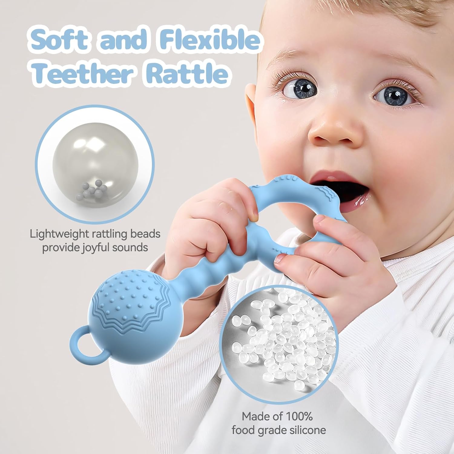 Teethers for Babies 6-12 Months, Rattles for Babies 0-6 Months, 2-in-1 Rattle and Teether Toy for Soothing Sore Gums and Keeps Little Ones Entertained, Food Grade Silicone, Blue