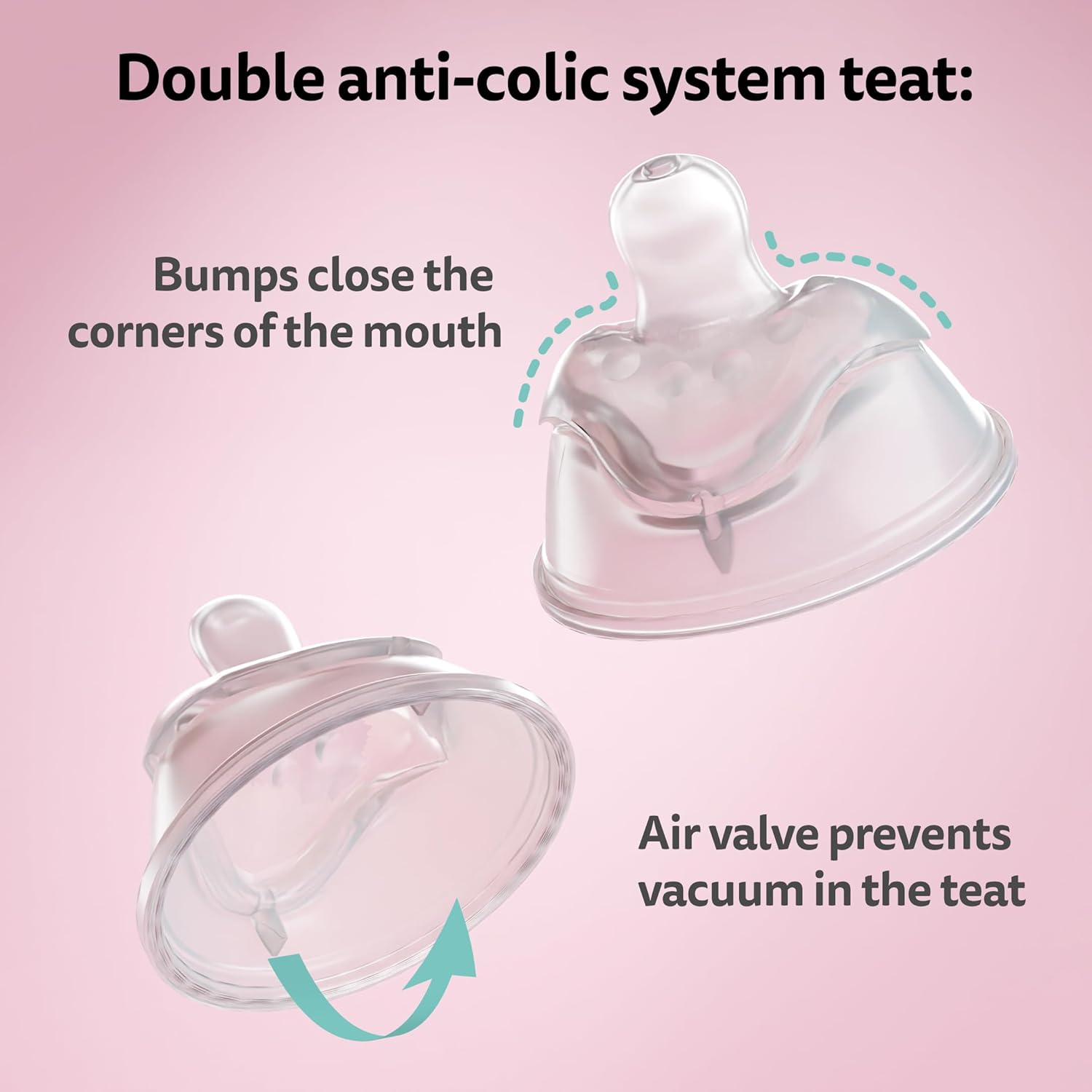 - UNIQUE DOUBLE ANTI-COLIC SYSTEM: This unique system provides doubled protection thanks to the ergonomically shaped teat that closes the corners of your baby’s mouth, stopping them from swallowing air. The air valves prevent a vacuum is formed inside the bottle.