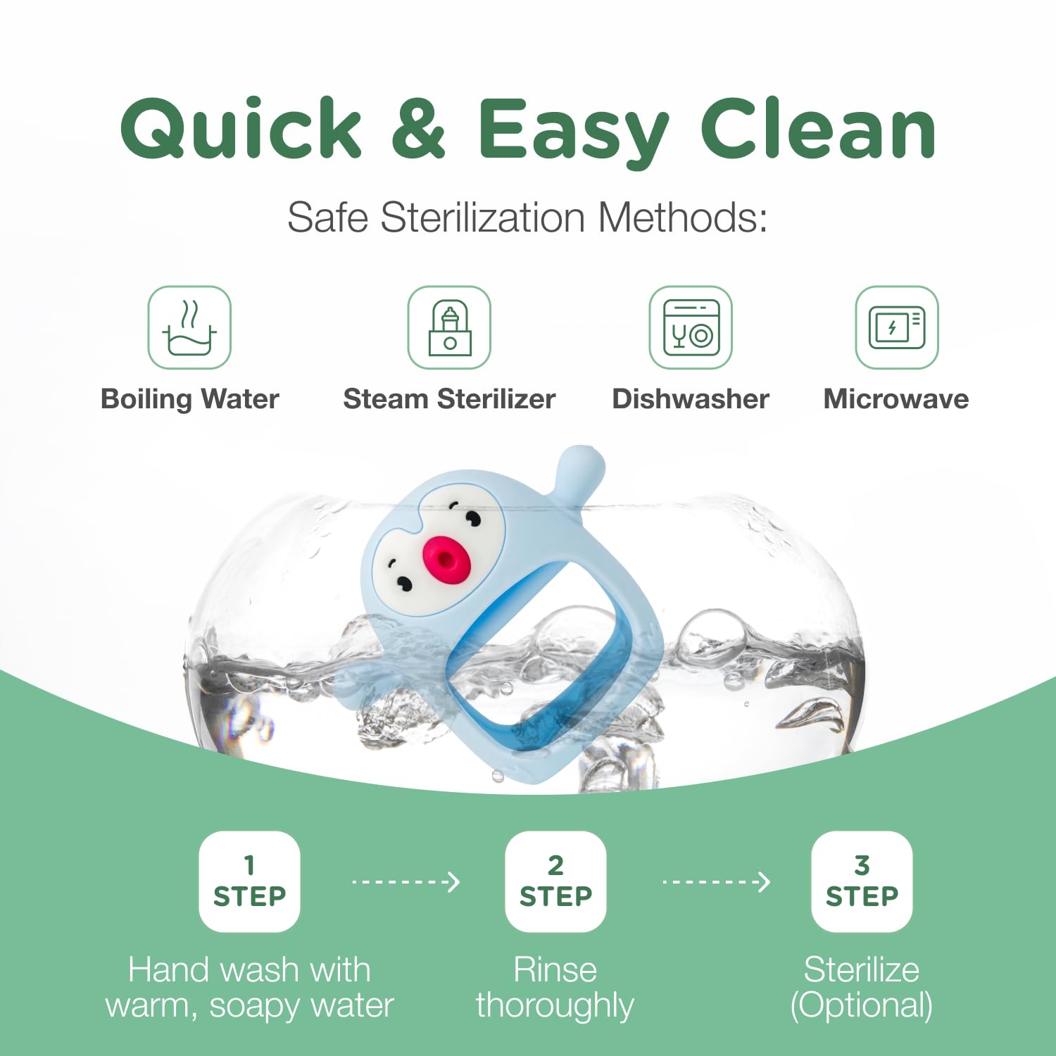 - Safe Material & Safe Design: Crafted from food-grade silicone, our teether guarantees 100% safety. The secure fit minimizes suffocation risks, and the non-choking design prevents insertion too far, ensuring a safe experience for babies. Dishwasher and freezer safe with no added chemicals or odors.