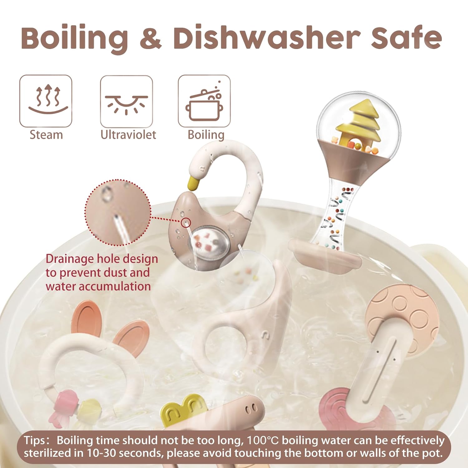 - 🌟【Safe High Temperature Sterilization】: This set of 6 baby teething toys ensures the health of your child. These toys are dishwasher safe, allowing cleaning & sterilization using steaming, boiling, or ultraviolet light. And the drainage hole design to prevent water accumulation puts the baby's health first. All toys are individually packaged in clear bags.