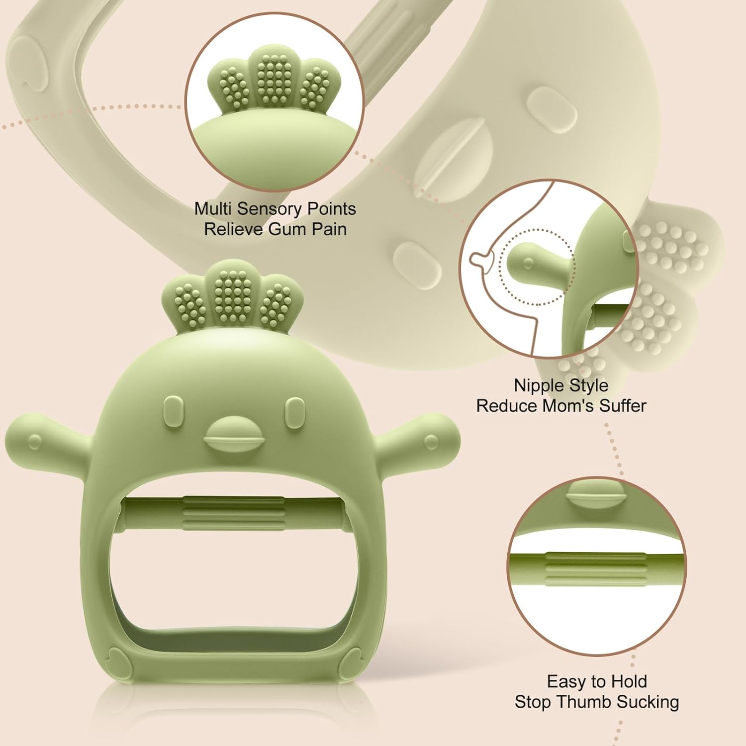- Never Drop Teething Mitten: This teething mitten fits over baby's little hands, the inner bar design makes the hand teether stay on baby's wrist to prevent dropping, and also protects baby from chewing on their fingers