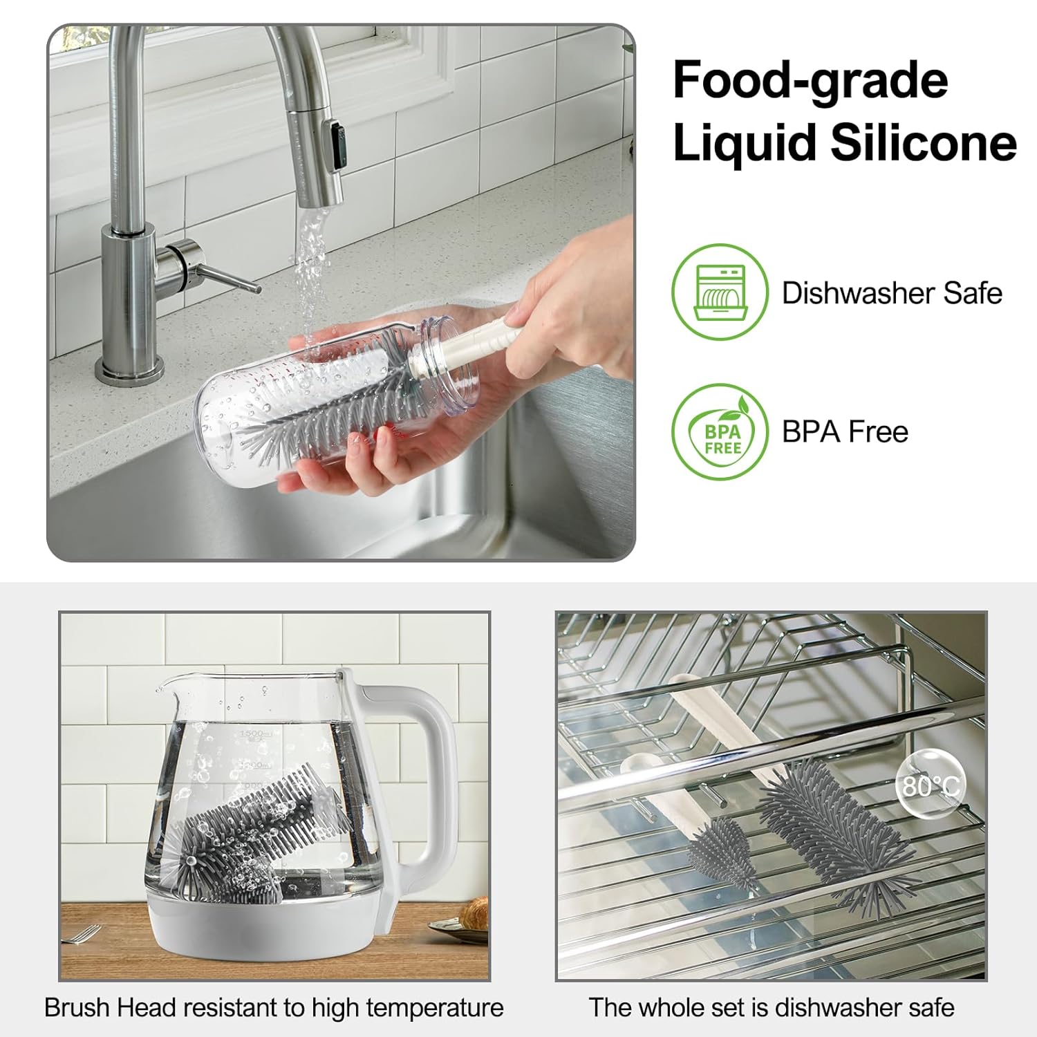 - 【Food Grade Patented Product】The upgraded baby bottle cleaner kit is made of food-grade liquid silicone material, durable and BPA free.The soft bristles will not fall off and wear small,and will not scratch the items being cleaned.Except for the soap dispenser,the entire set is dishwasher safe.The silicone brush head is detachable and can be boiled, but the handle cannot be boiled
