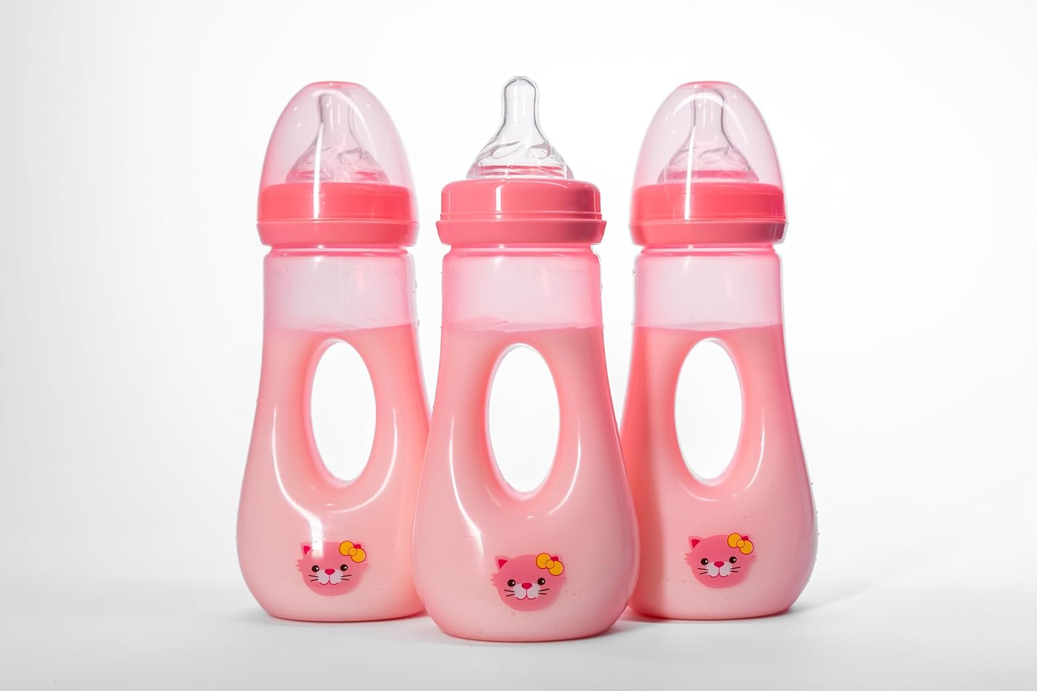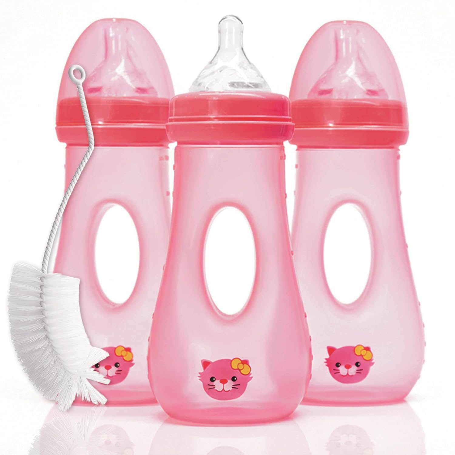 Avima Easy Grip Anti Colic Baby Bottles, BPA Free, 8 oz. Wide Neck w/Medium Flow Silicone Nipples & Bottle Brush Pink Set (Pack of 3)