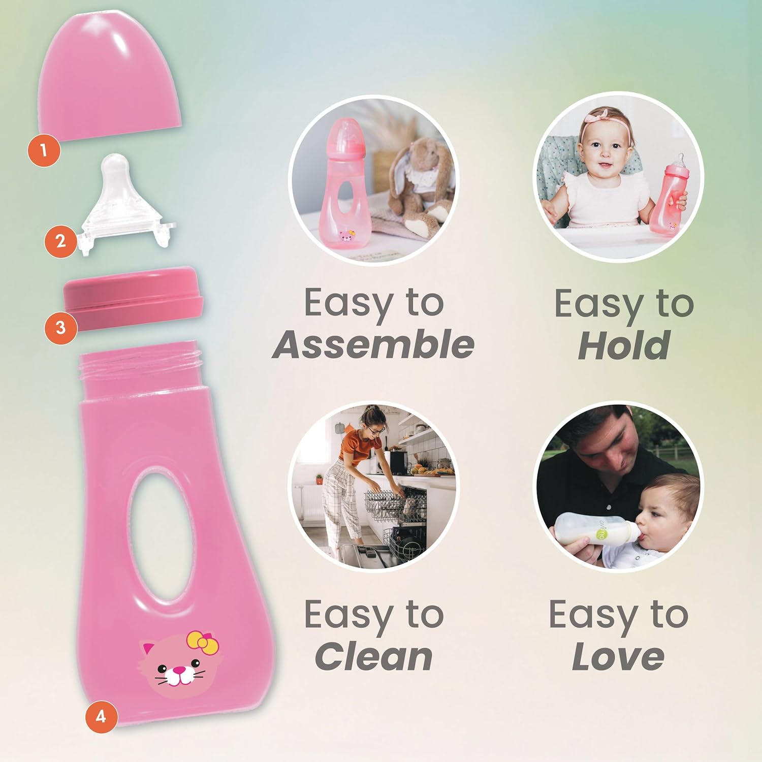 - Easy Hold Design - Our wide neck easy grip bottles' ergonomic design features an 8 ounce formula capacity with easy-grip sides, perfect for little hands to hold securely as they learn to drink more independantly.