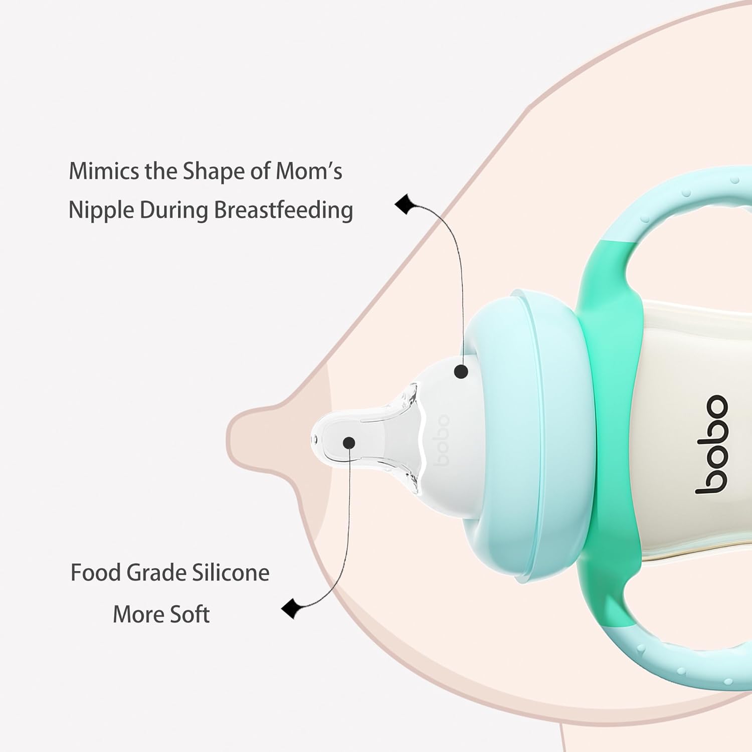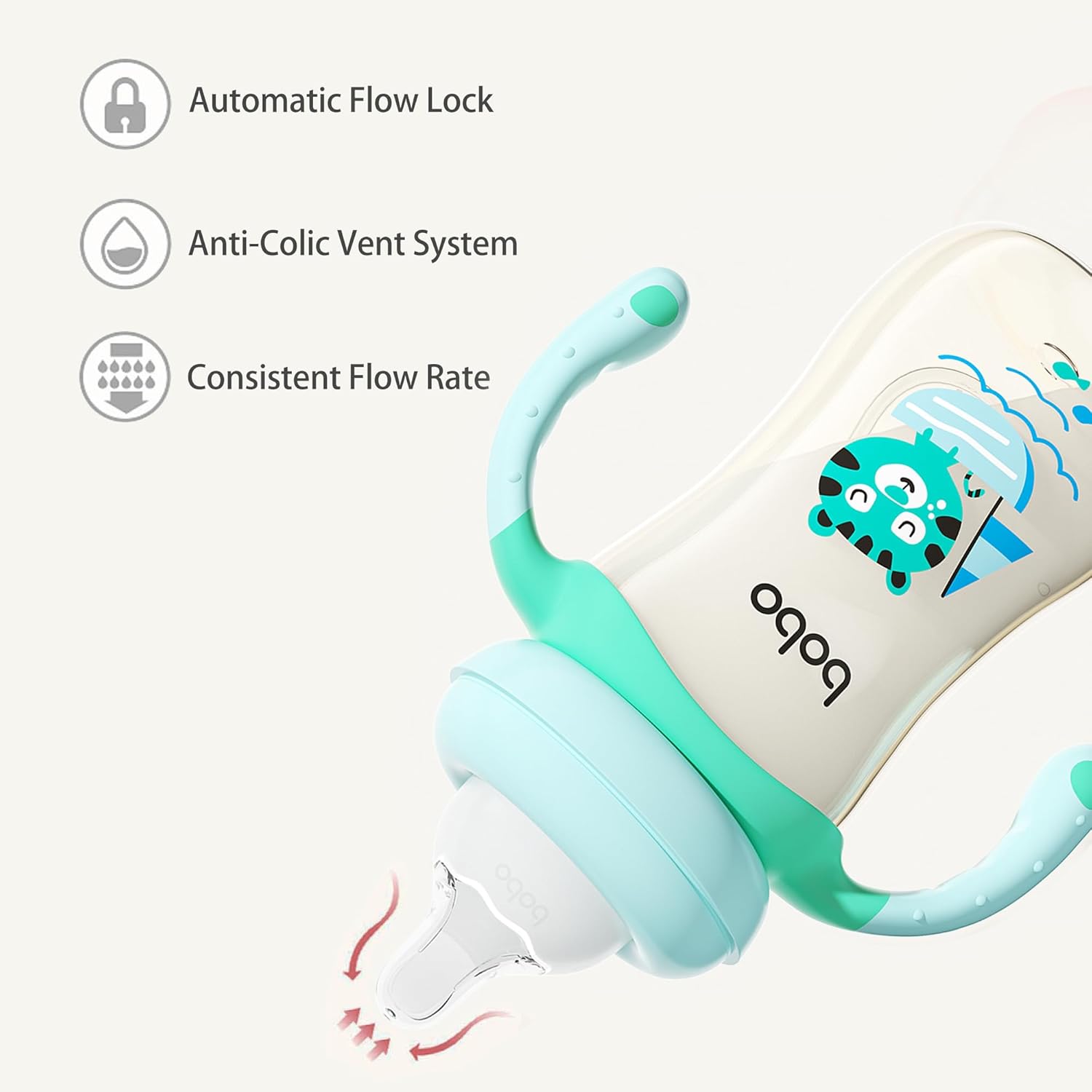 - The bottom of the nipple has intelligent pressure regulating valve, balance internal and external pressure, milk and air separation, to avoid the baby breathing too much air caused by colic flatulence.