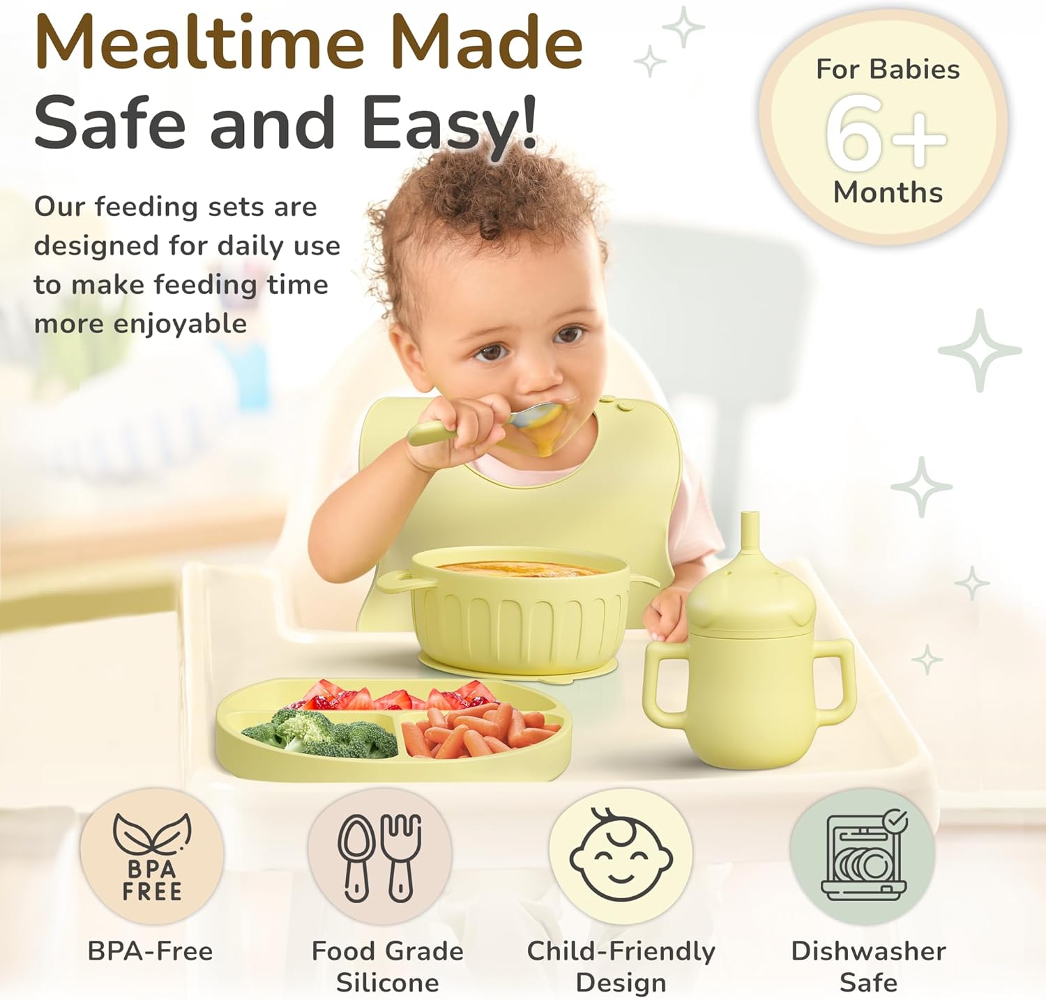 - MESS-FREE MEALTIMES: Our toddler plates and bowls set come with a slip-resistant suction base that stays put, no matter how lively your little one is during mealtime. And the sippy cup for 6+ month old? It's designed with a lid to avoid any spills