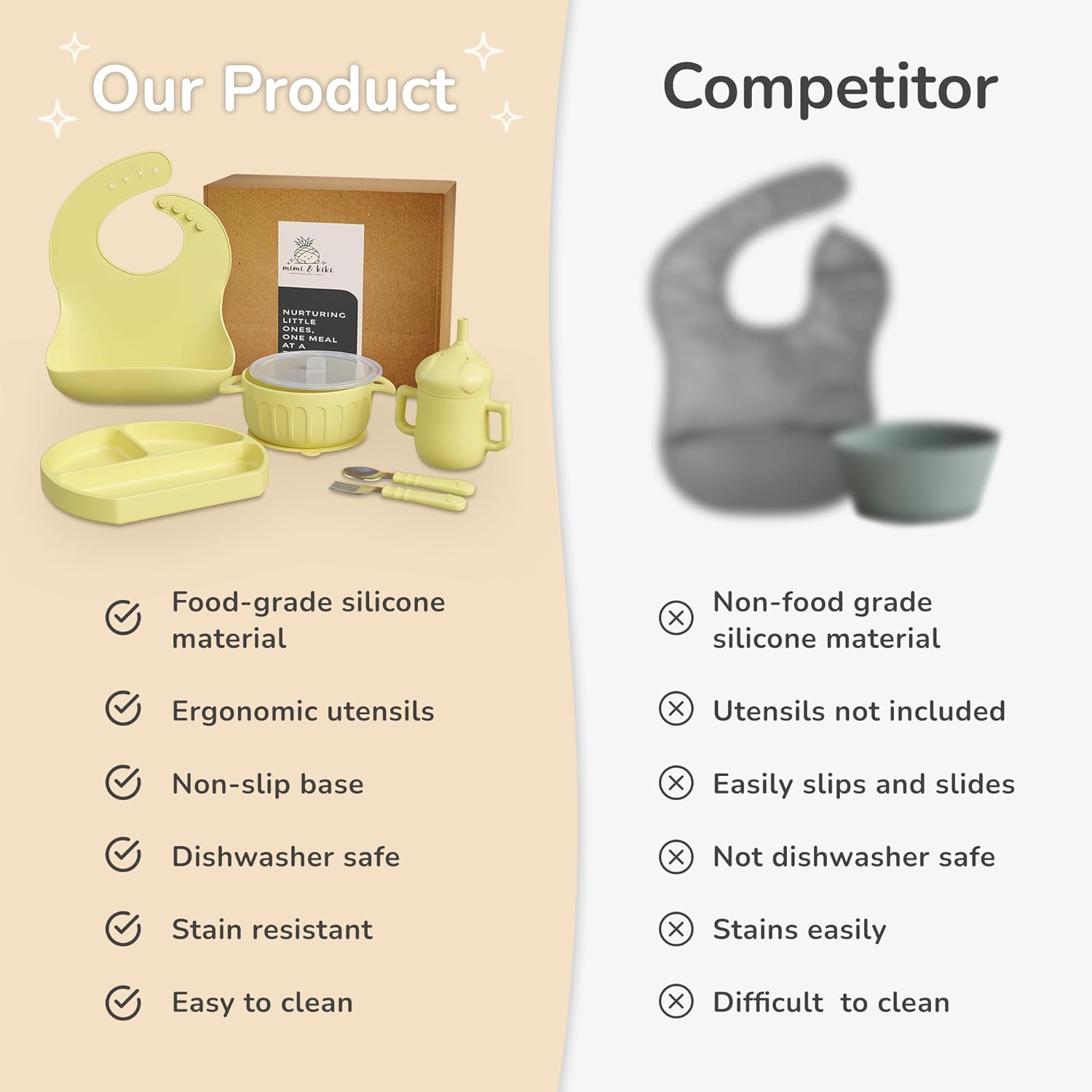mimi & kiki BPA-Free Silicone Baby Feeding Set, Baby Plates and Bowls Set, Baby Led Weaning Supplies, Silicone Suction Plate, Baby Utensils, Bib and Cup, Self Feeding, Dishwasher Safe (Yellow)