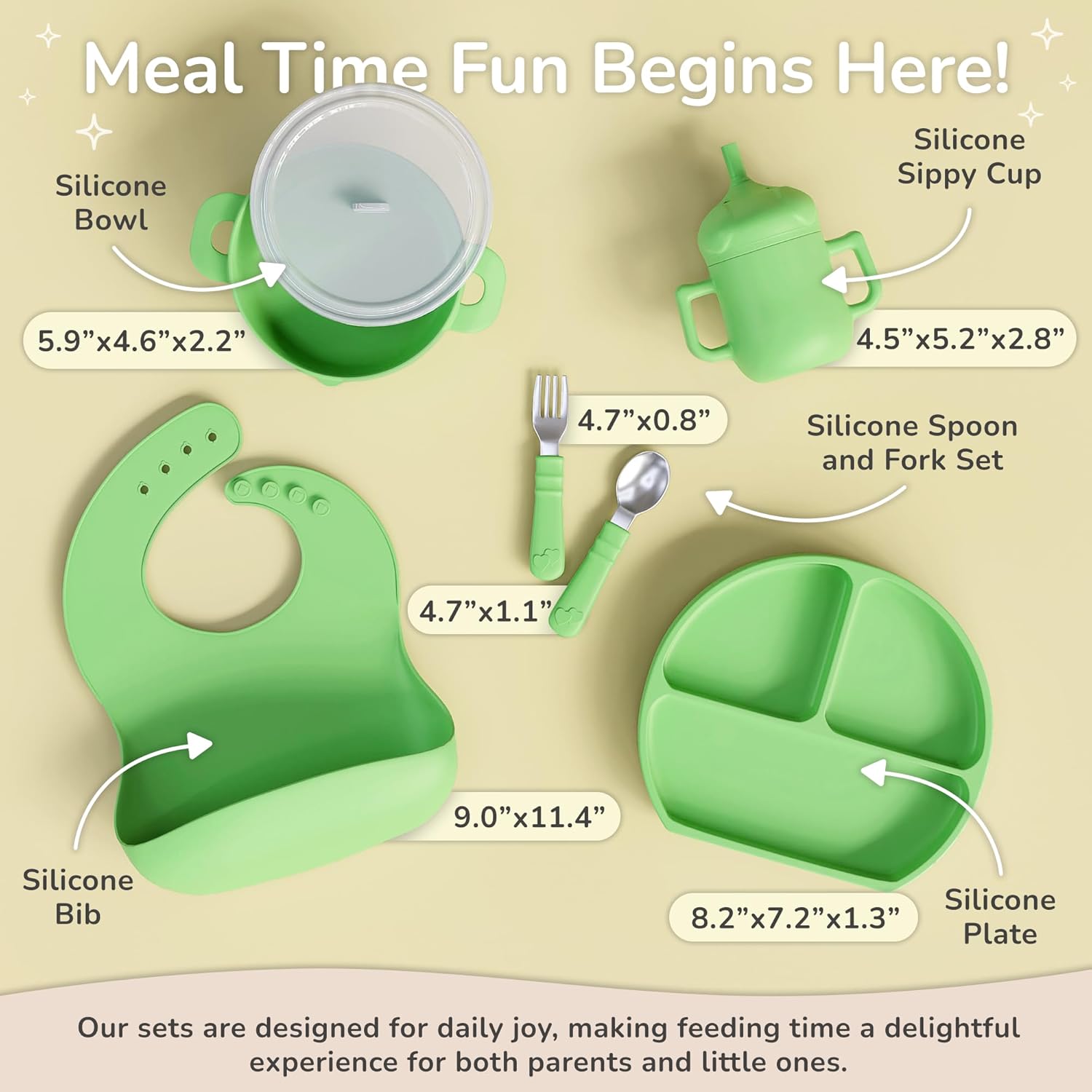 mimi & kiki BPA-Free Silicone Baby Feeding Set, Baby Plates and Bowls Set, Baby Led Weaning Supplies, Silicone Suction Plate, Baby Utensils, Bib and Cup, Self Feeding, Dishwasher Safe (Green)