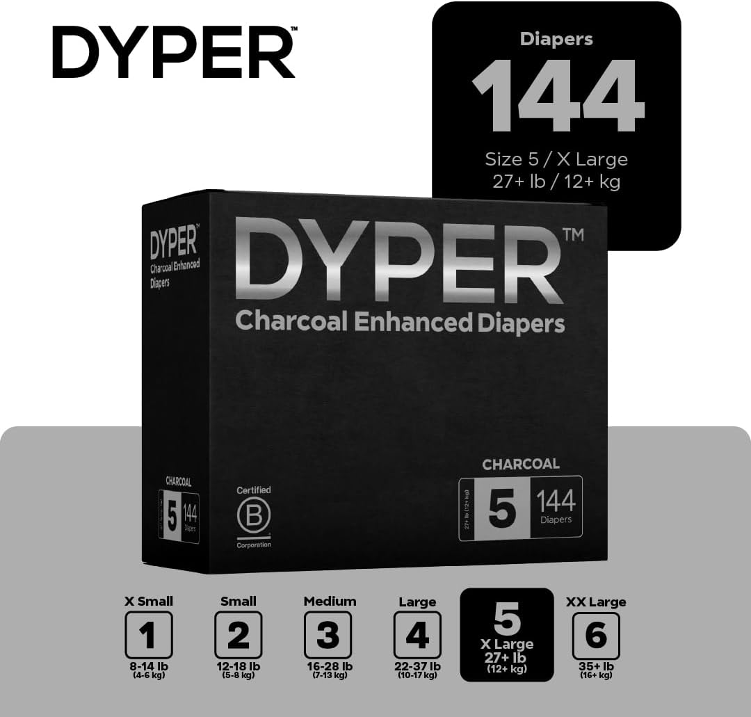 DYPER - Charcoal Enhanced Day & Overnight Disposable Baby Diapers - Made with Plant-Based* & Honest Ingredients, Hypoallergenic for Sensitive Skin - Size 5, (144 Count)