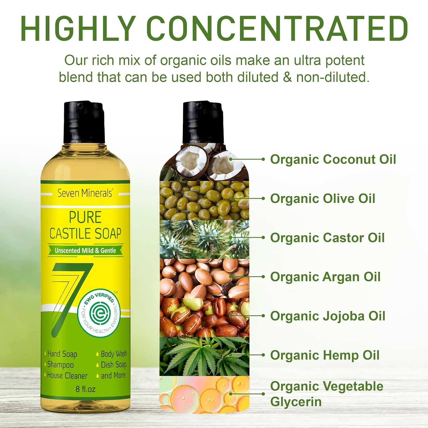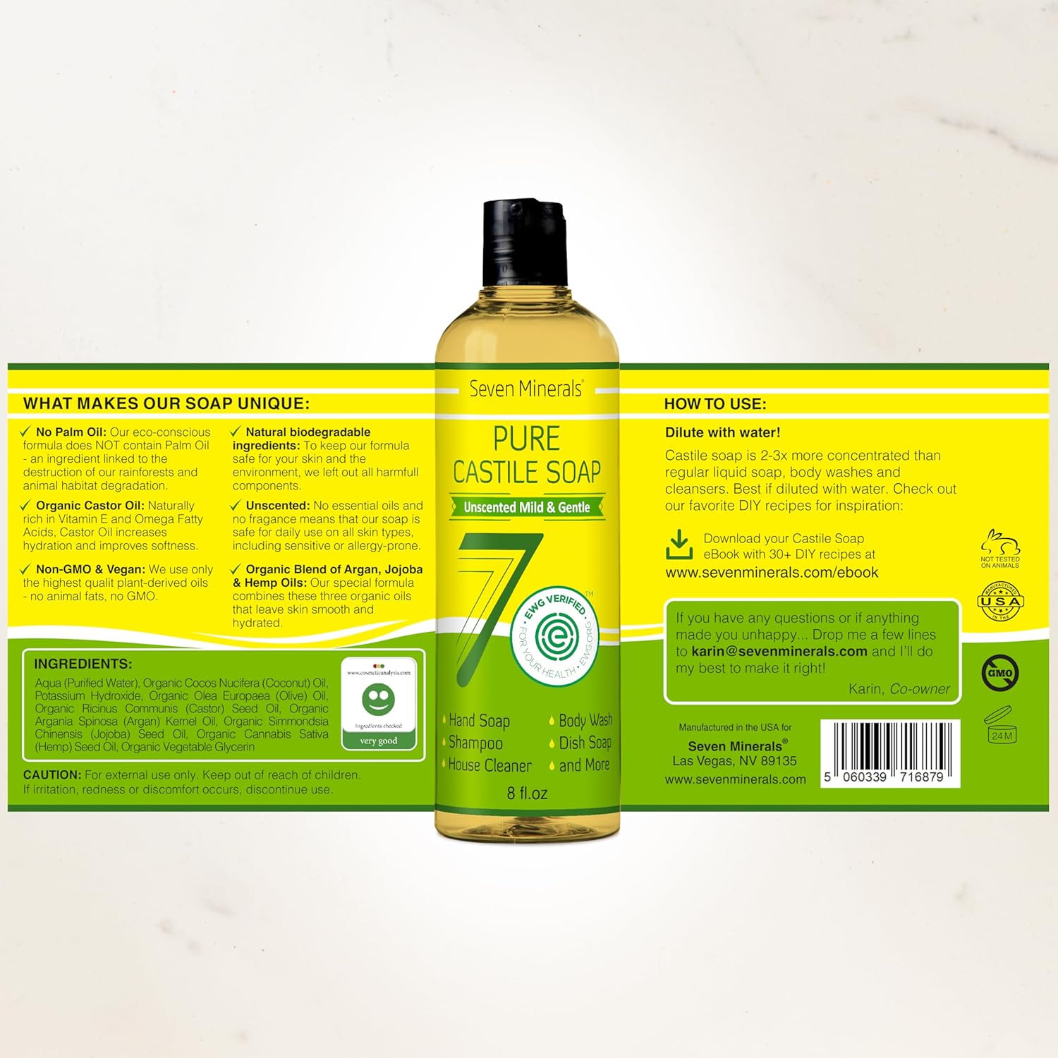 Pure Castile Soap - No Palm Oil, GMO-Free - Gentle Liquid Soap For Sensitive Skin & Baby Wash - All Natural Vegan Formula with Organic Carrier Oils (8 Fl Oz, An Unscented)