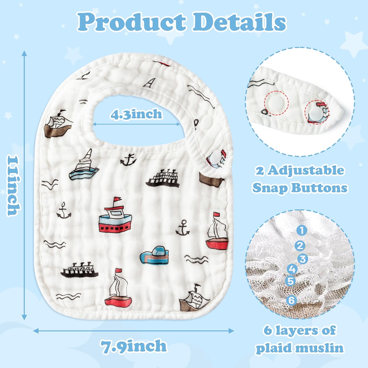- Soft Material: This feeding bib is constructed of cotton muslin, which is light, breathable and fade-resistant. This cloud-like soft material will make your baby feel comfortable and take care of your baby's sensitive skin in a healthy way.