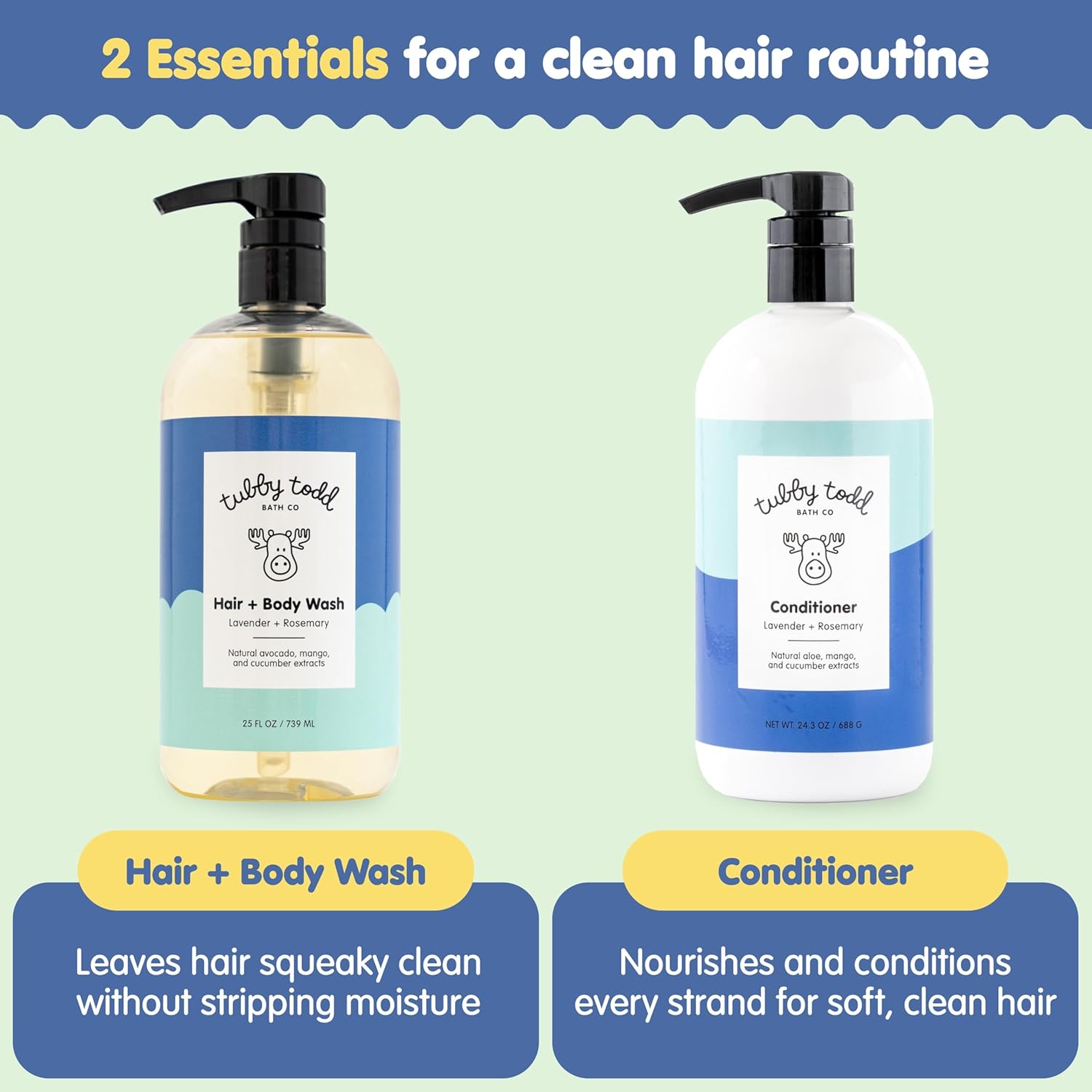 - EASY 2-STEP BATH TIME ROUTINE: Lather Hair + Body Wash onto damp hair and skin for a deep but gentle clean. Follow with our Conditioner, applying a quarter-sized amount to the ends of wet hair. Leave for three minutes before rinsing with warm water for silky soft, tangle-free hair.
