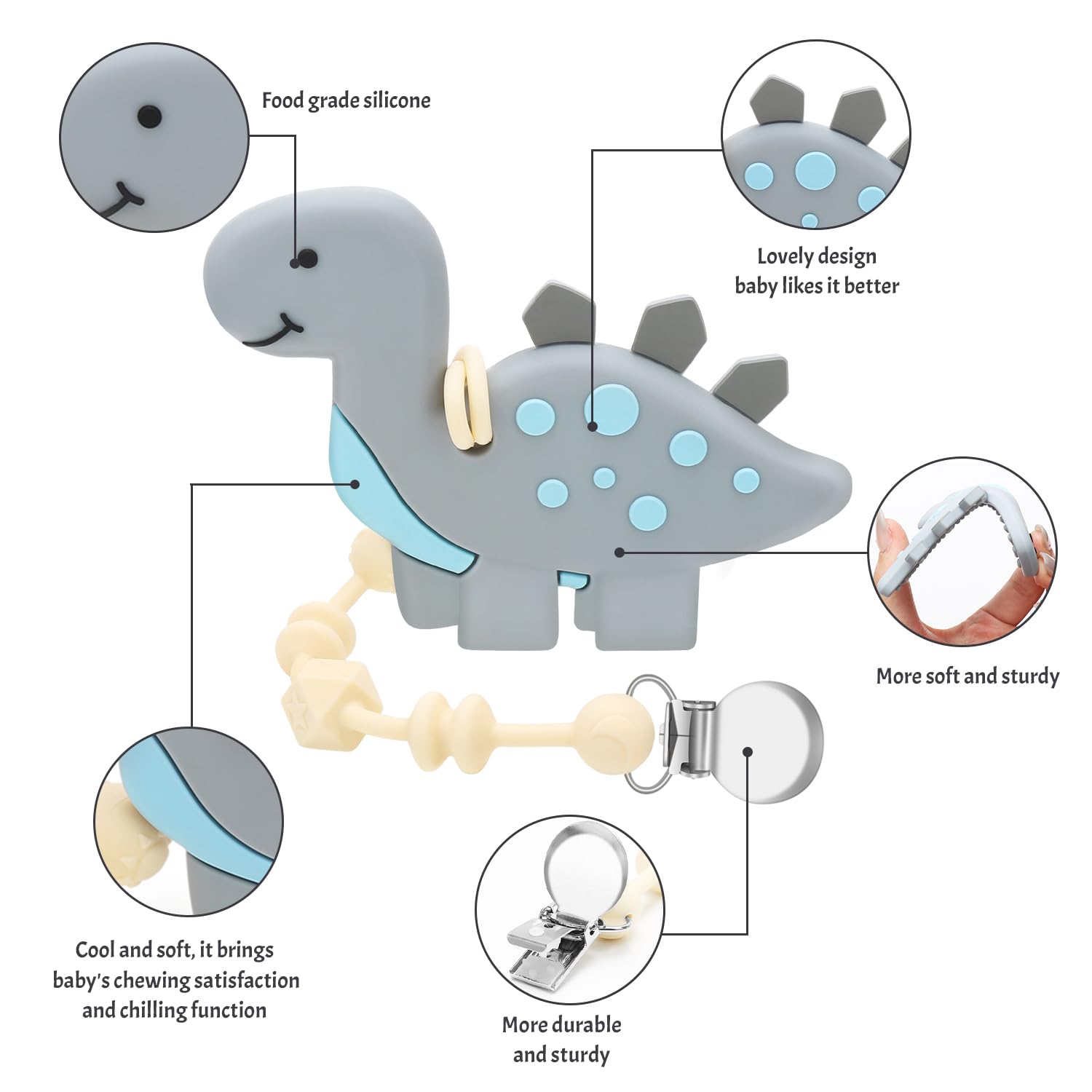 Baby Teething Toys for Babies, Dinosaur Teether Pain Relief Toy with One Piece Design Pacifier Clip Holder Set, Freezer Safe Neutral Shower Gift for Boys and Girls (Gray)