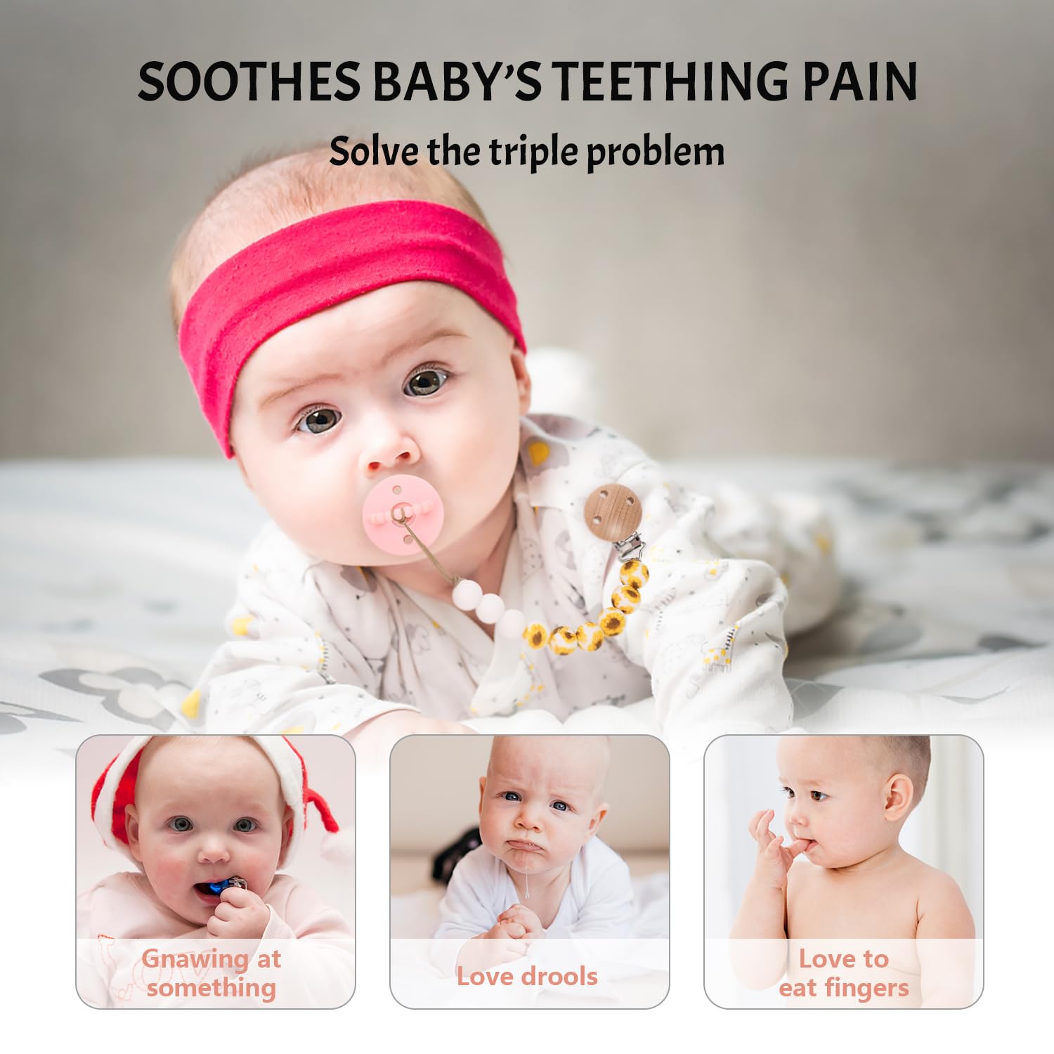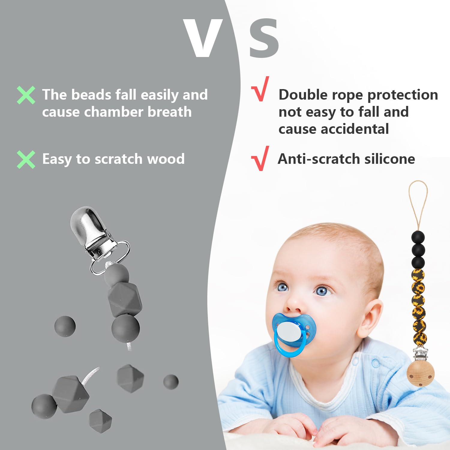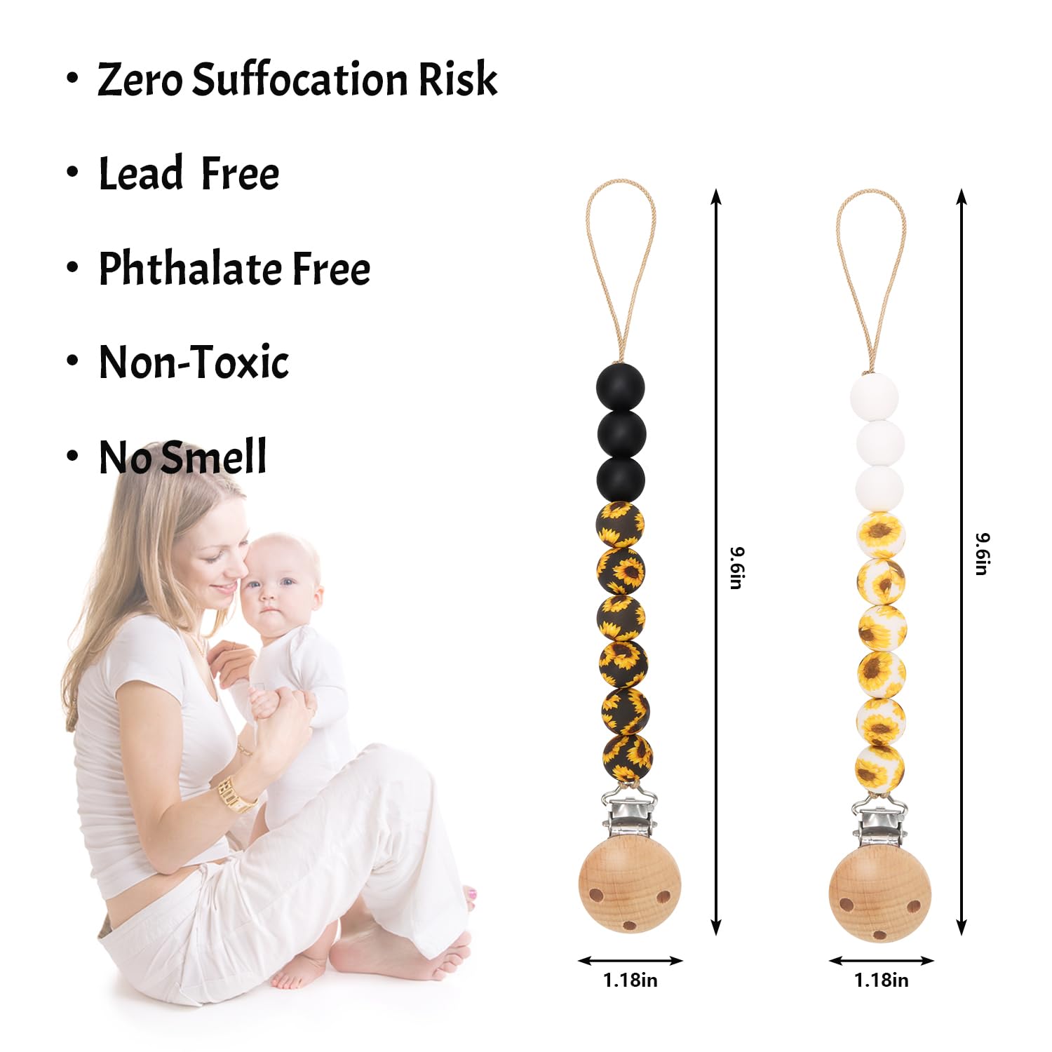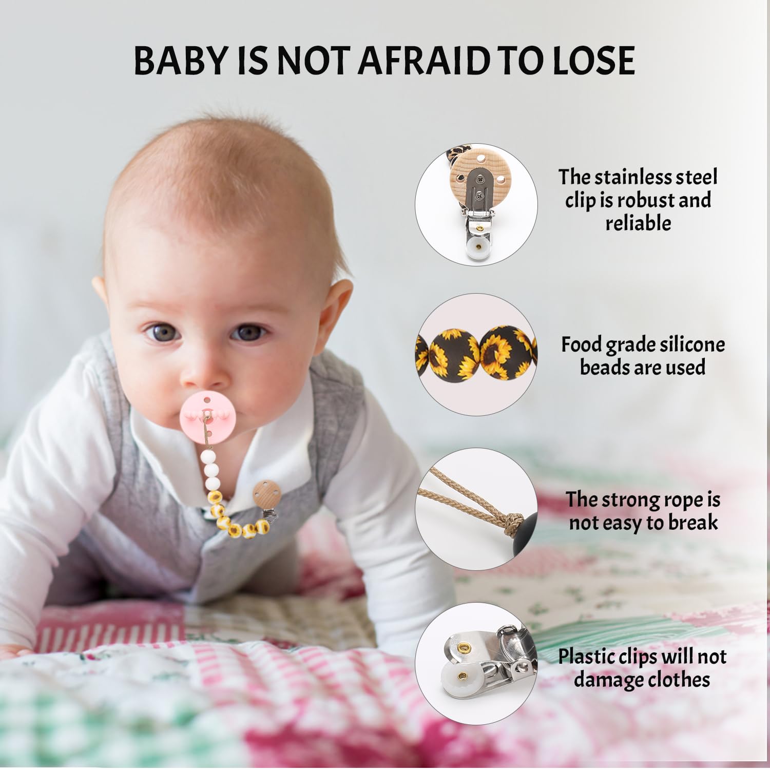 - Cute Pacifier Clips: Made from 100% food grade silicone, our pacifier clips are free from harmful chemicals! With print texture silicone beads, feels good on sore, teething gums, and our designs provides visual and tactile stimulation for babies.