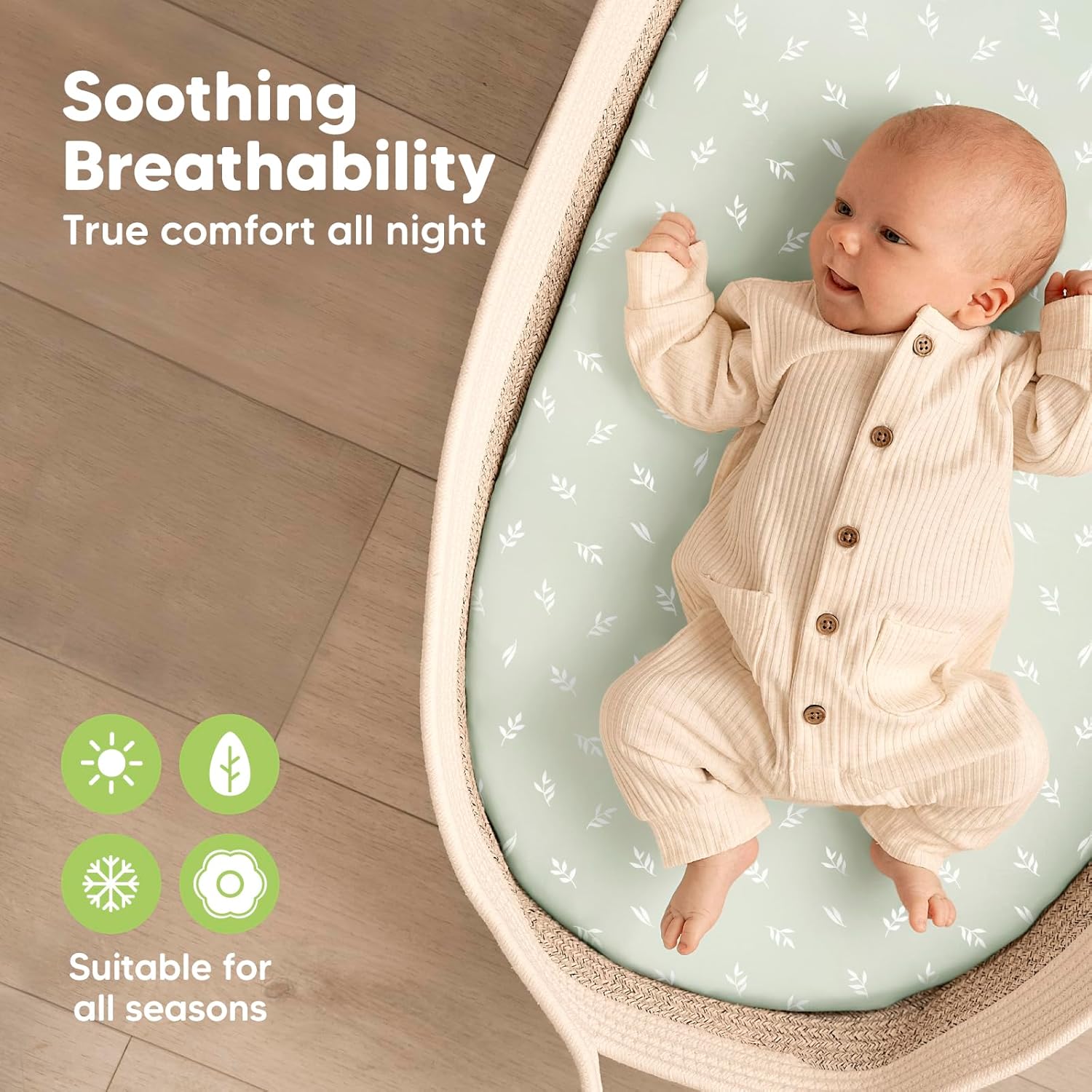 2-Pack Organic Bassinet Sheets for Girls, Boys - 100% Cotton Bassinet Mattress Sheets Compatible with Halo Bassinest Swivel Sleeper, Graco, Baby Delight, Chicco, Unisex Fitted Bassinet Sheets (Herb)