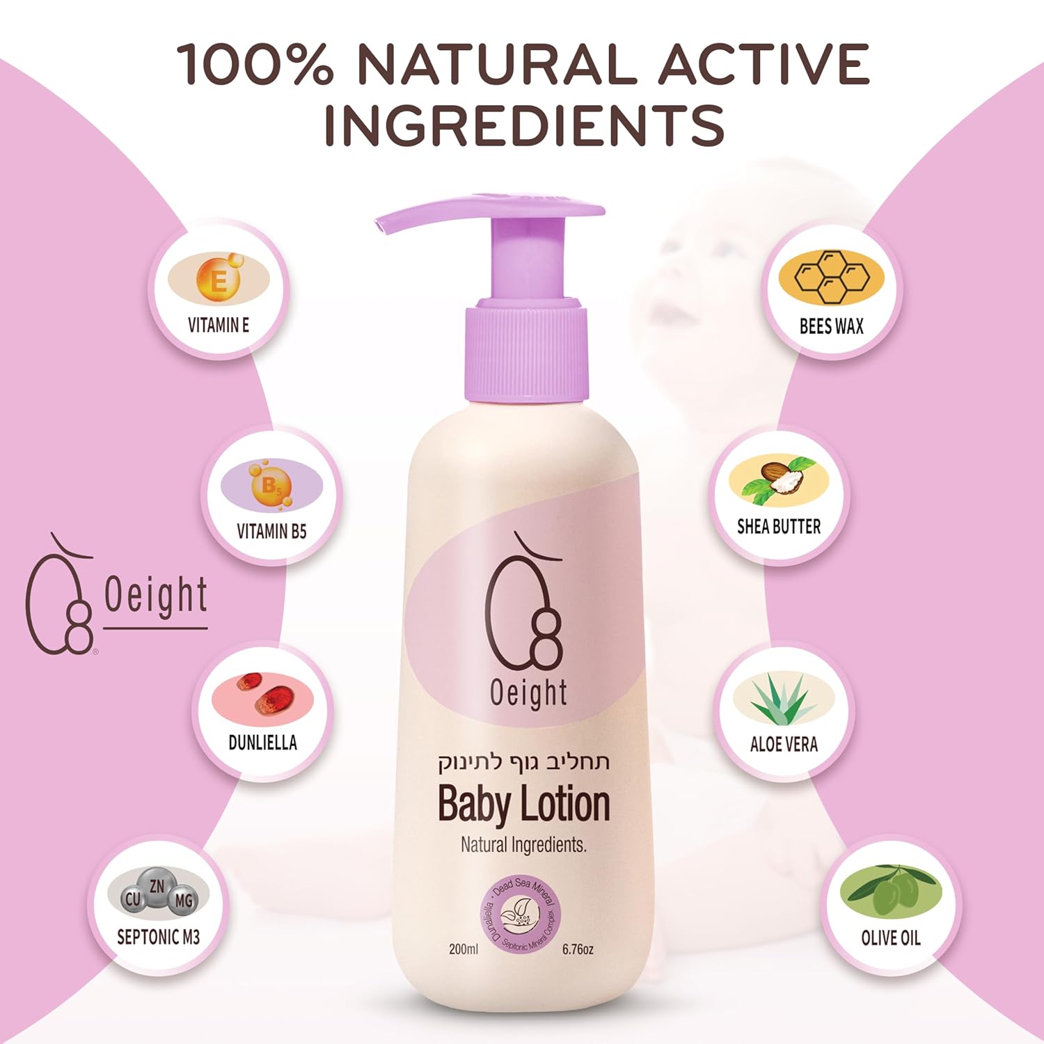 - NATURE AND SCIENCE MATTER: By using O8 OEIGHT BABY LOTION, your baby will be happy and feel pampered being massaged with this healthy, natural skin moisturizer; with its light scent, it contains extra-gentle ingredients such as Dunaliella Salina Microalgae and Dead Sea Minerals that soothe, relax, and protect while maintaining skin moisture and natural PH levels; the 6.76 fluid ounces come in a plastic tube with pour spout cap, ready for using or giving