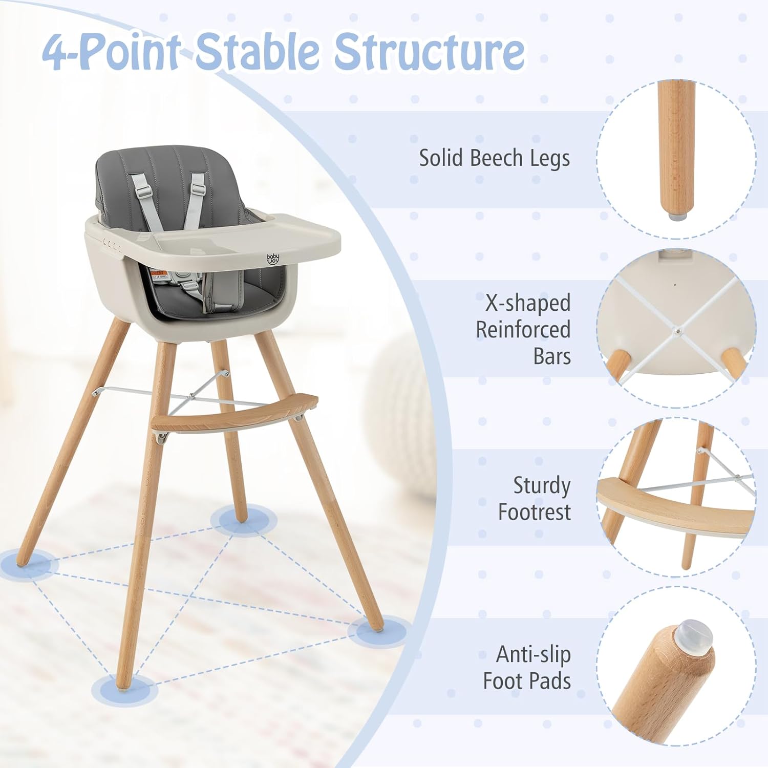 - Stable Construction: Solid beech legs, X-shaped reinforced bars and 4-Point stable structure offer strong support. Additionally, the baby high chair is equipped with anti-slip foot pads to increase stability while protecting the floor from scratches. 4 extra protective foot pads are also included for the low chair.