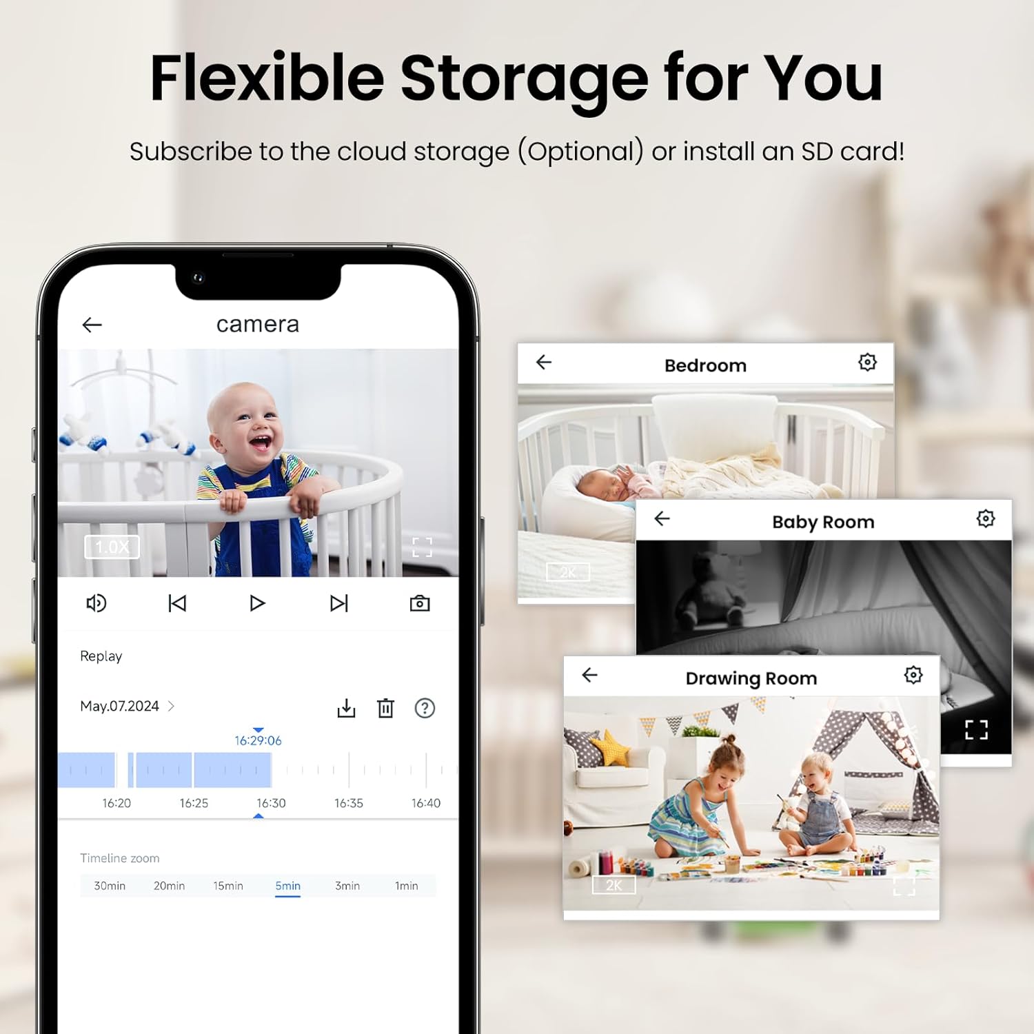 - 【Optional Cloud & 24/7 continuous Recording】: The indoor security camera supports SD card storage and cloud storage. Continuous recording can be realized by installing an SD card(Up to 128GB of storage and SD card not included). You can also choose cloud storage to record important moments for you, but it's not mandatory. All videos uploaded to the cloud are encrypted and cannot be viewed by anyone other than the owner. And home cameras indoor offer you a 30-day free trial of cloud storage.