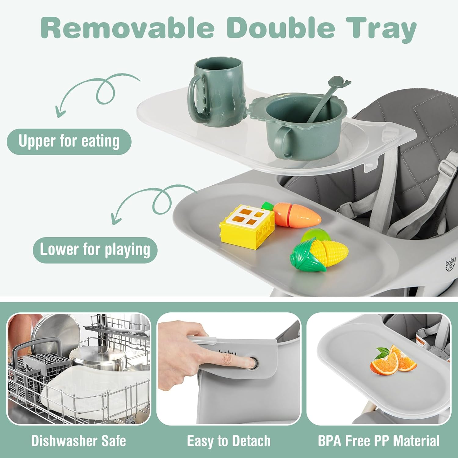 - Removable Double Tray: This infant feeding chair is equipped with a double tray that can be easy to detach according to your needs. The upper tray is suitable for eating and feeding, and the lower tray is ideal for playing. The tray is made of BPA free PP material and harmless to the health of your baby.