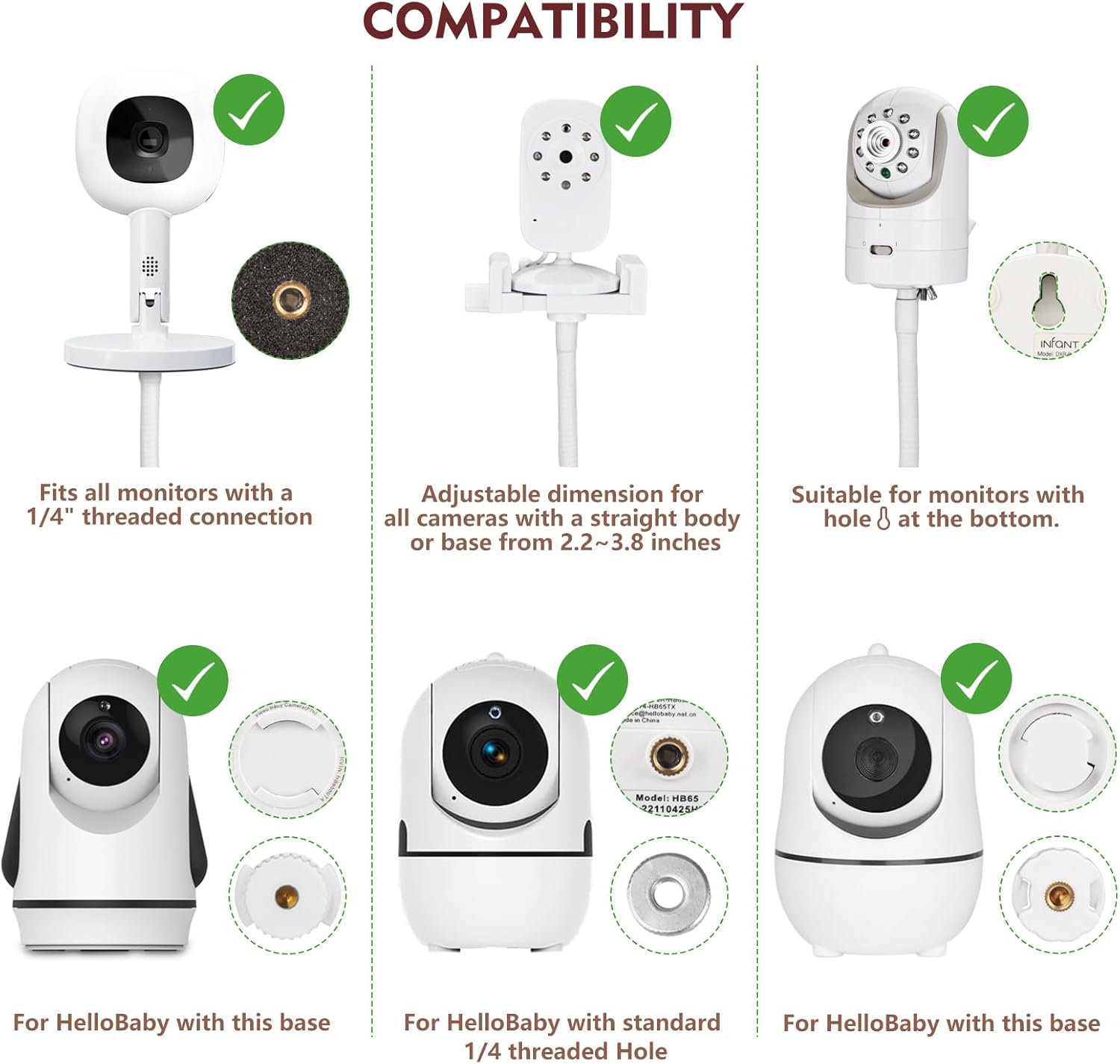 - Compatible Devices : GoodBaby, Nanit Pro Smart Monitor & Flex Stand, HelloBaby Monitor HB6550 pro/HB65/HB66/HB248/Eufy/Vtech VM901/VAVA/ANMEATE SM935E/iFamily SM650; Other Cameras with 1/4 Thread Connection like Nanit Pro/Infant Optics DXR-8/Vtech VM924/ANMEATE SM24 GoodBaby, Nanit Pro Smart Monitor & Flex Stand, HelloBaby Monitor HB6550 pro/HB65/HB66/HB248/Eufy/Vtech VM901/VAVA/ANM… See more