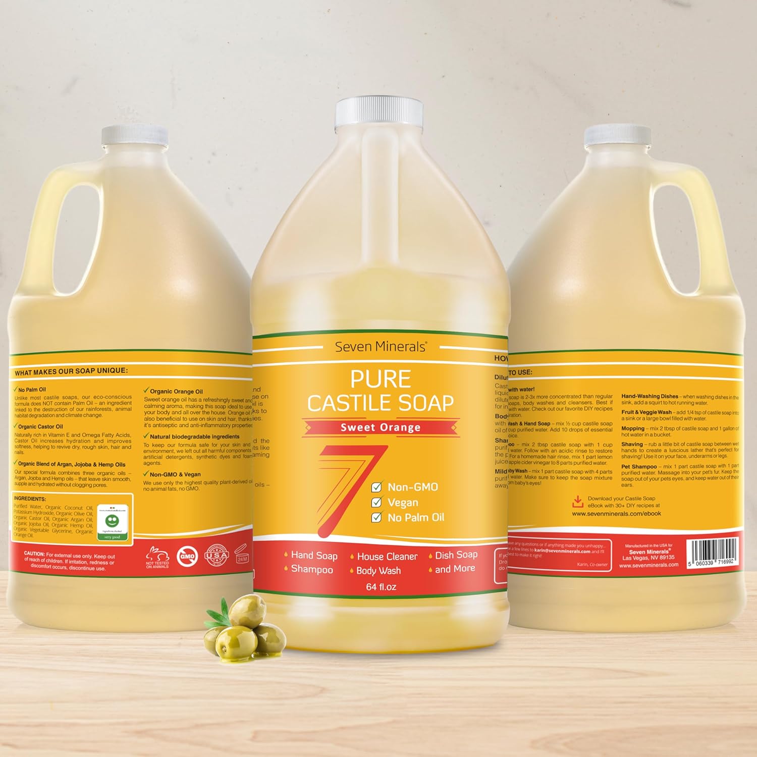 Seven Minerals Pure Castile Soap, Sweet Orange 64oz - No Palm Oil, GMO-Free - Gentle Liquid Soap For Sensitive Skin & Baby Wash - All Natural Vegan Formula with Organic Carrier Oils