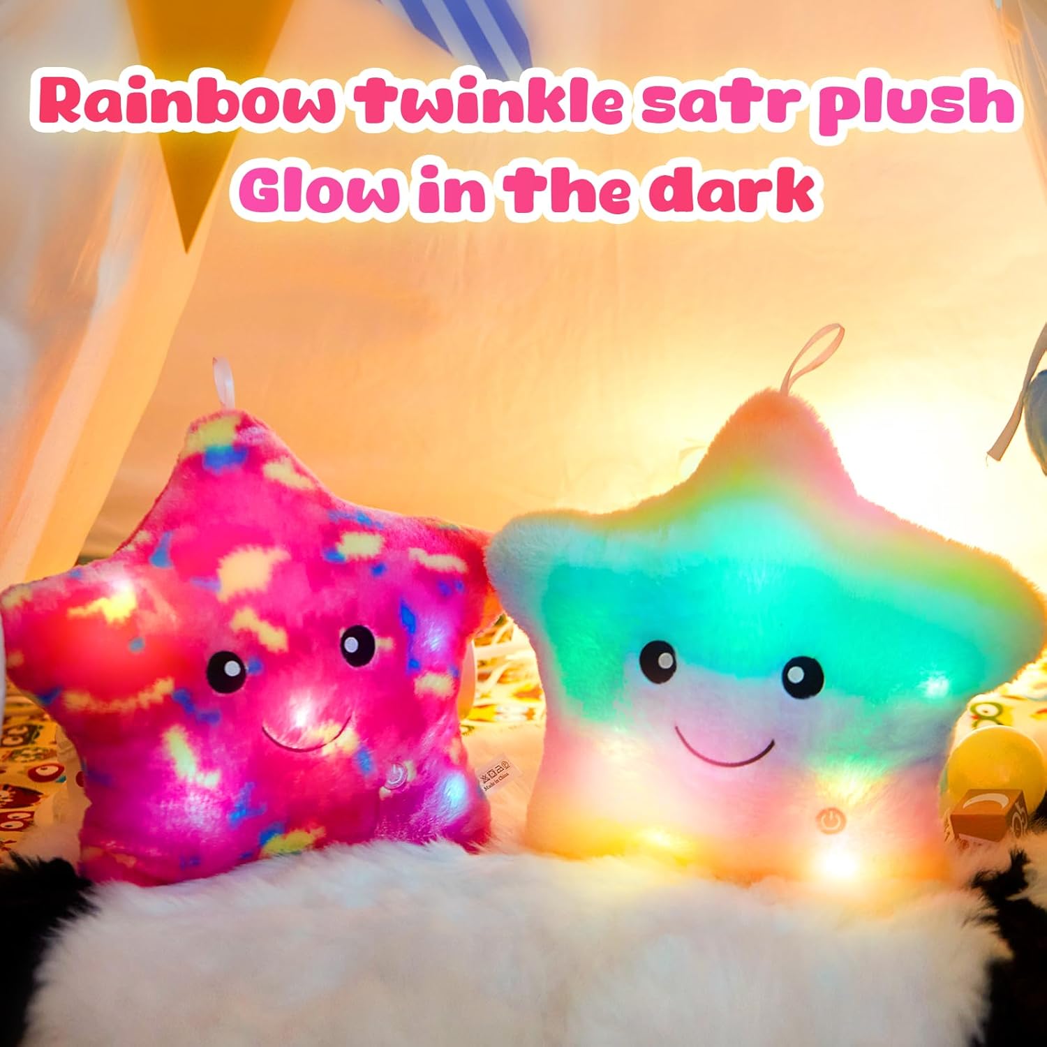- Enhance your child's imagination with our Twinkle Star Pillow. Adorned with a delightful hanging rope for easy display and featuring a convenient push-button, this star pillow doubles as a captivating night light. With a simple press, watch as it illuminates, cycling through a spectrum of colors to create a mesmerizing glow. Plus, forgetful moments are no problem - it automatically switches off after 15 minutes. Please note: Avoid submerging it in water due to its LED light feature, and remember to provide two AA batteries (not included).