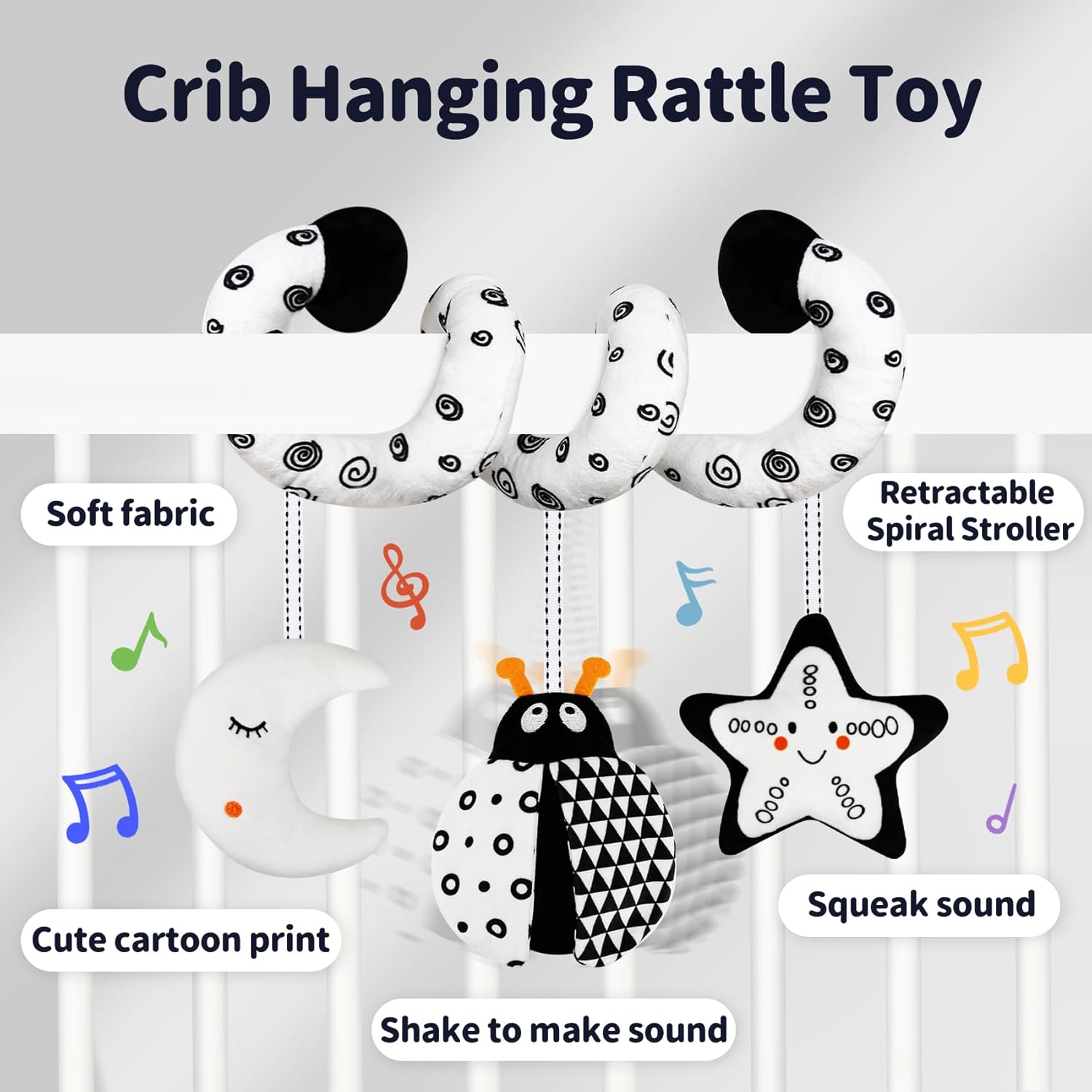 - STROLLER TOYS FOR BABIES:High-contrast black and white cartoon patterns can attract newborns' fuzzy eyes and stimulate the development of their visual senses.