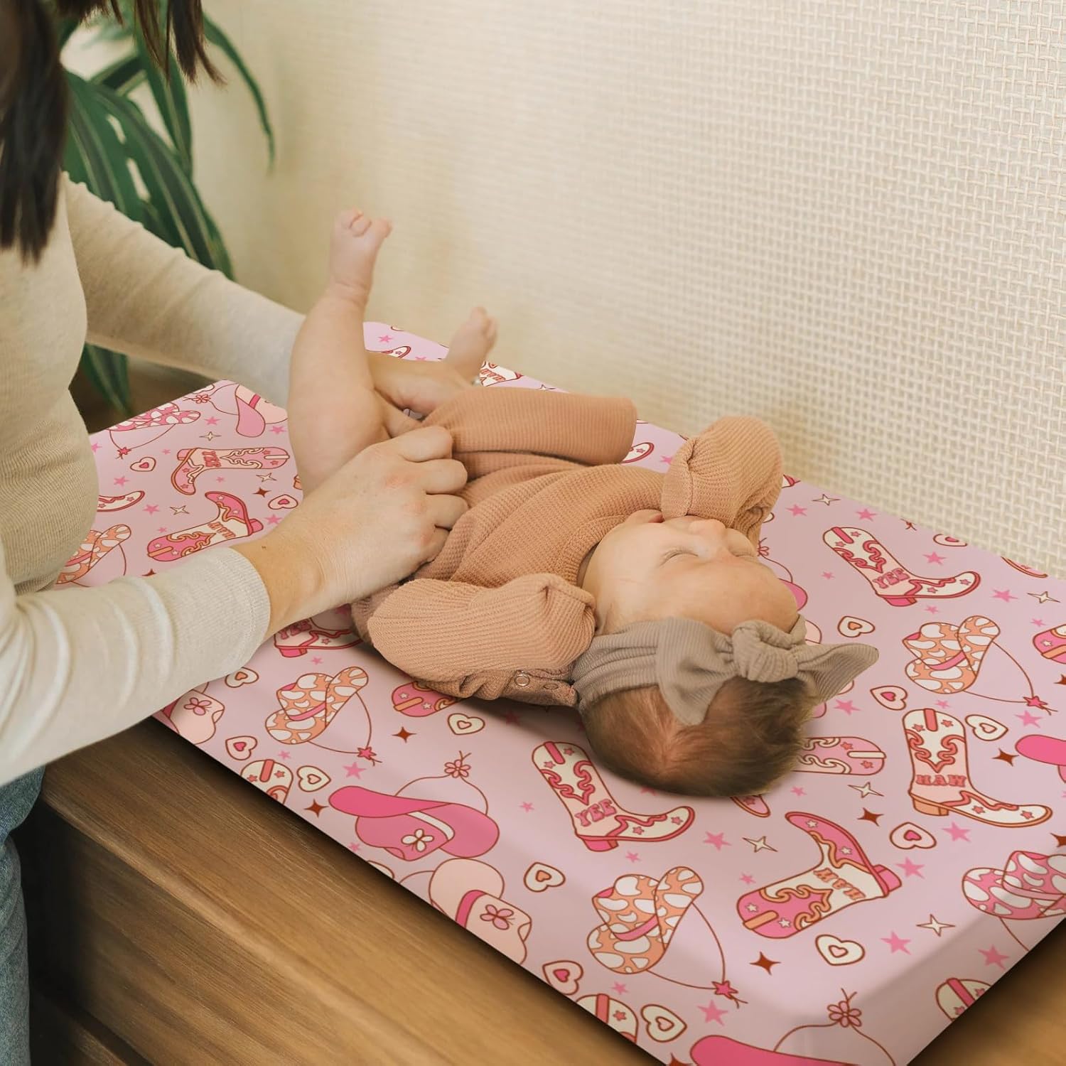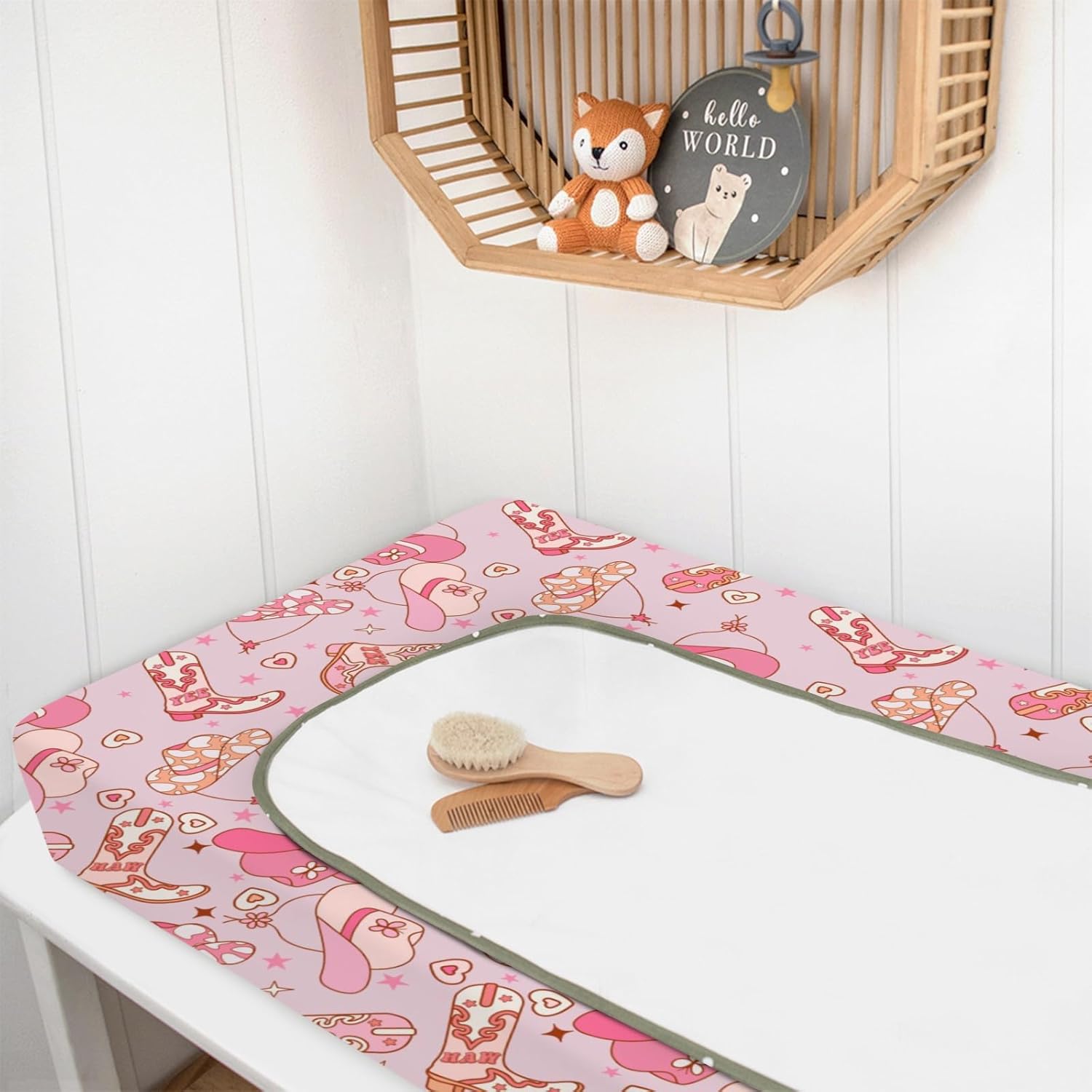 Western Cowgirl Yee Haw Hat Boots Changing Pad Cover for Baby Girls, Pink Cow Lover Star Wild West Diaper Change Table Covers, Soft Stretchy Safe Snug Fitted Changing Mat Sheets Fit 32