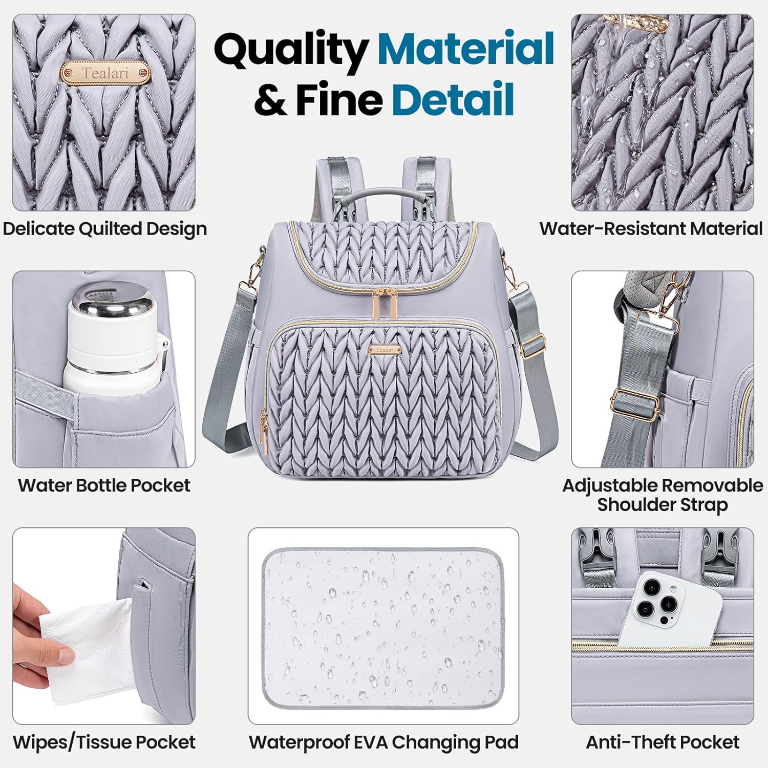- 【Stylish Baby Diaper Bag & Portable Changing Pad】This baby diaper bag,made of lightweight reliable water-resistant and wear-resistant nylon fabric,delicate quilting design looks excellent with any outfit.High quality gold-plated zippers,smooth and durable,which is enough for you to love it.Backpack size:14.6"L x 8"W x 13.2"H,Capacity:20 L.The portable diaper changing pad,made of Skin-friendly and waterproof fabric design,make the baby more comfortable and convenient.(size: 24" x 15.7")