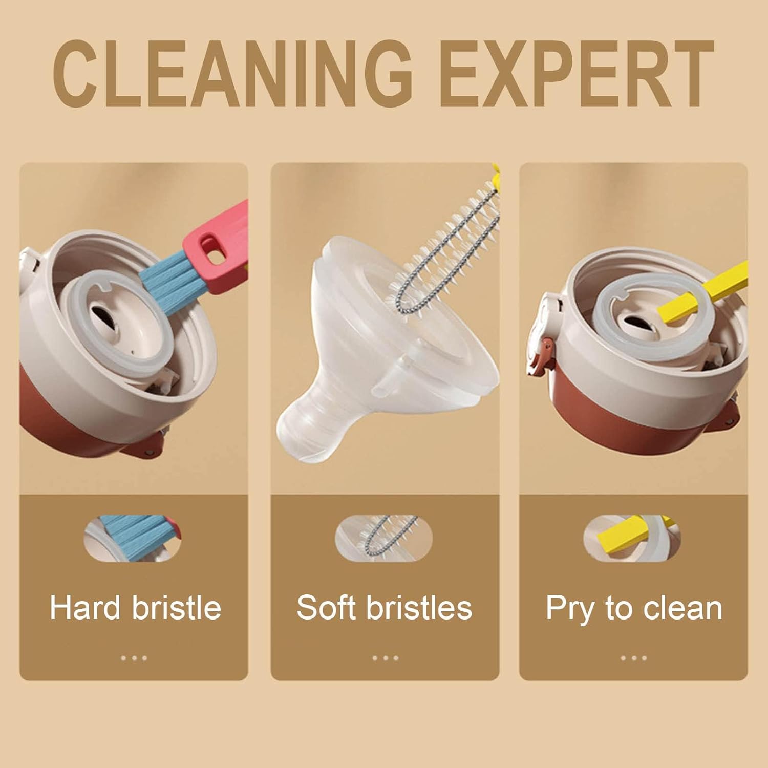 - 🧹【Wide Range of Applications】 From glasses and sports cups to kettles and pacifiers, our versatile 3-in-1 lid brushes cater to a myriad of cleaning needs. Whether it's removing stains or reaching tricky spots, this multifunctional brush set is indispensable for maintaining cleanliness throughout your home.