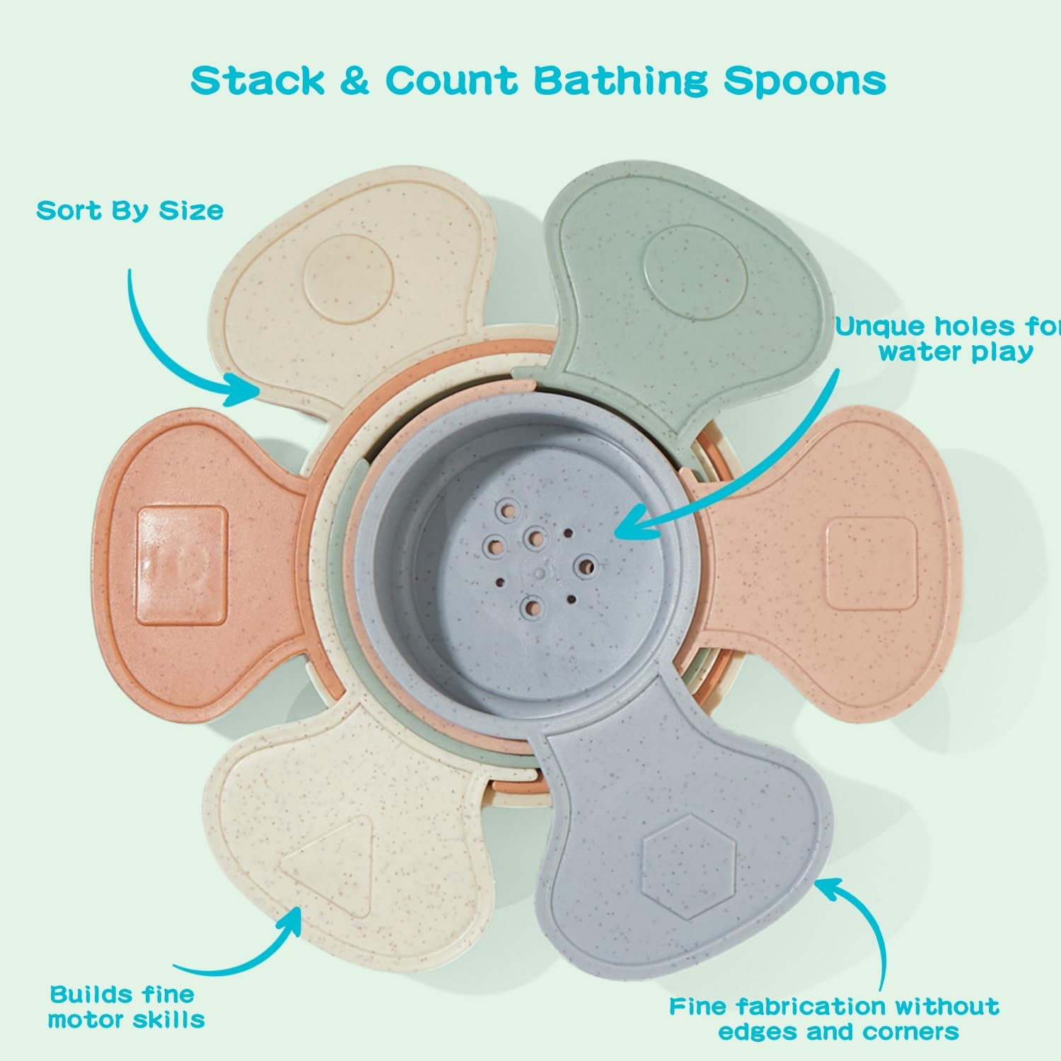 - Educational Bath Toys: These mold free bath toys can be stacked, nested, and played with in countless ways, encouraging creativity and developing fine motor skills. There are numbers and graphics on 6 spoons of different colors and sizes, making them great for teaching colors, orders, numbers recognition and counting. Linking, scooping and pouring help develop fine motor skills, too
