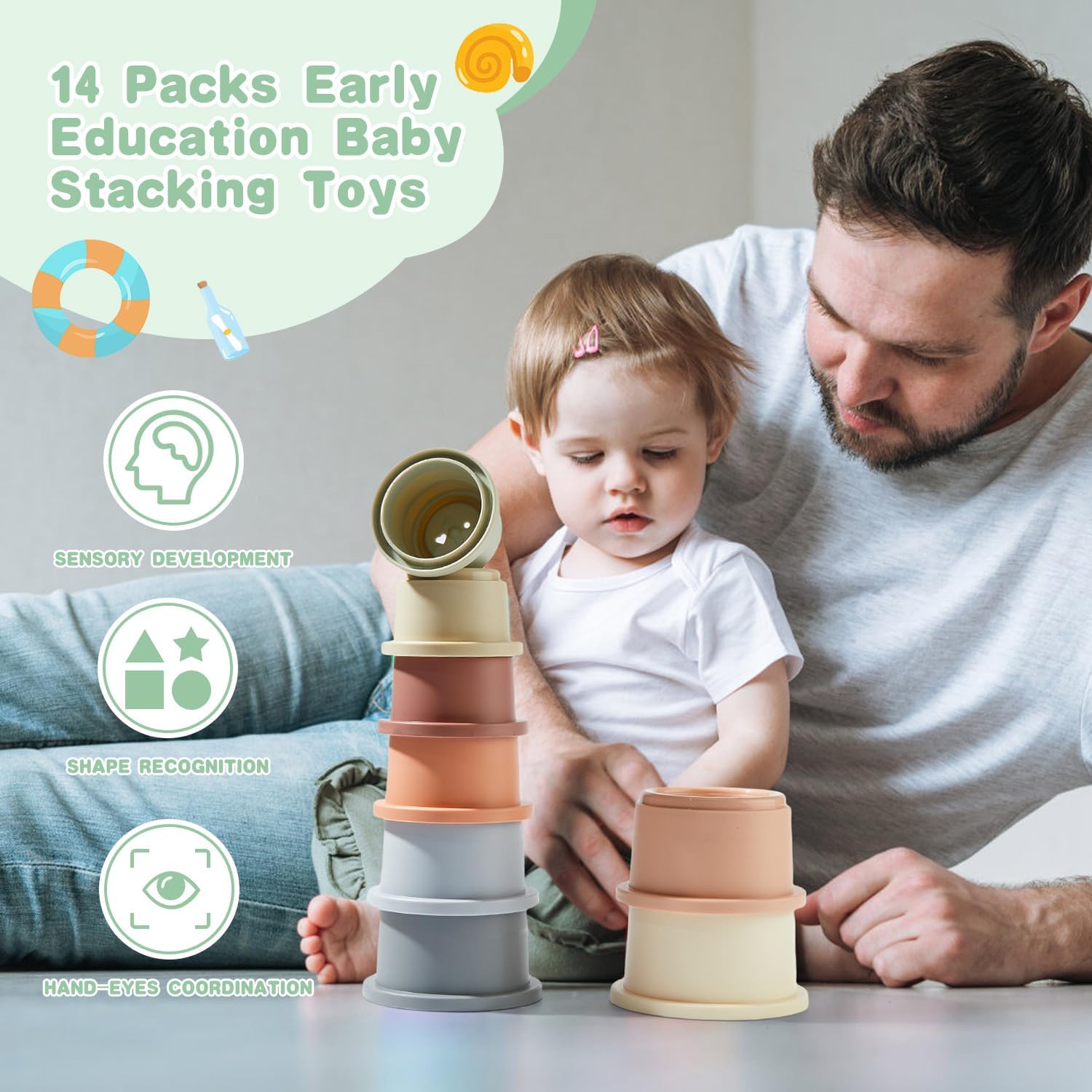 - 14PCS Bath Toys: Baby bath toys include 8pcs bath cups and 6pcs bath spoons, the size of the stacking cups are designed specifically for babies' small hands