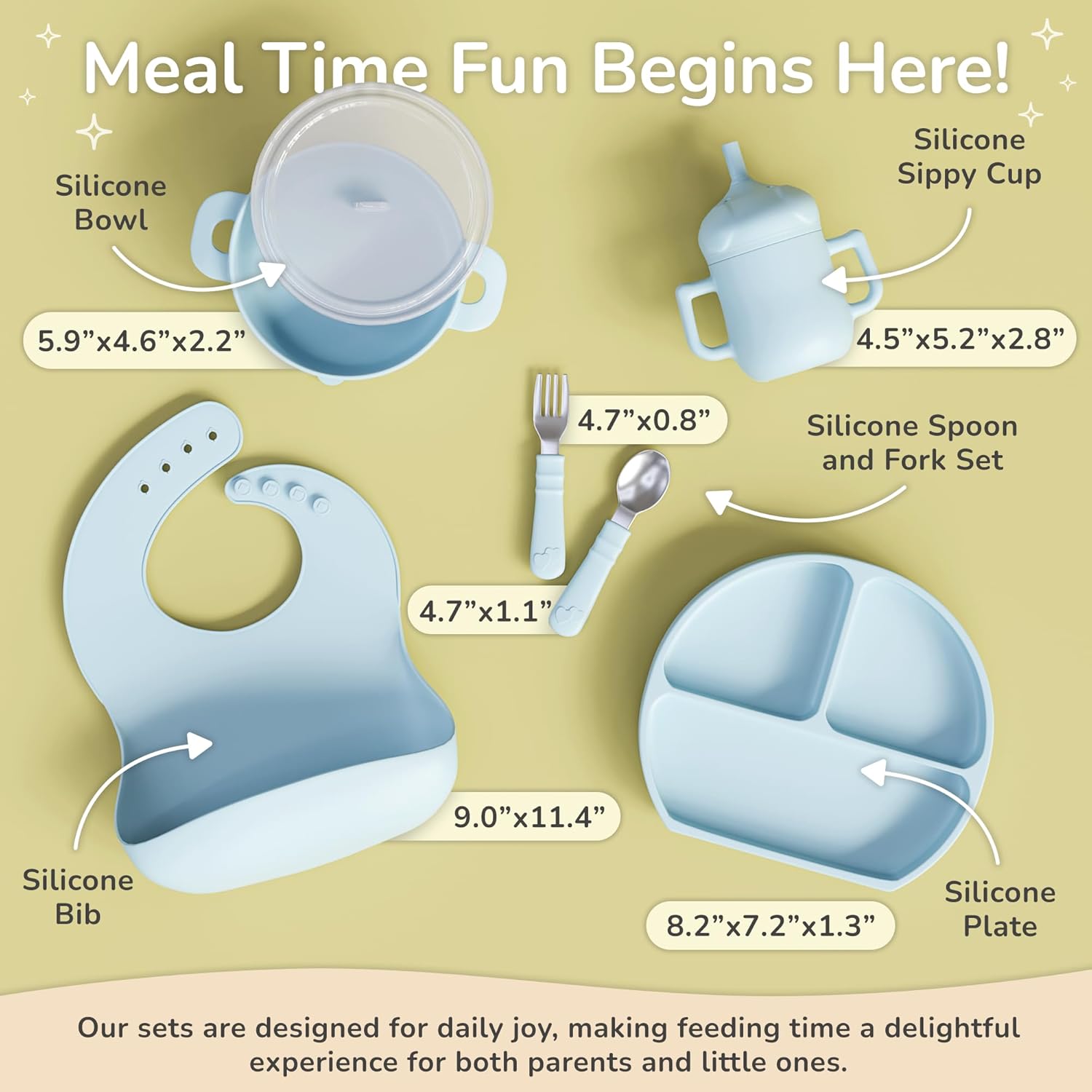 mimi & kiki BPA-Free Silicone Baby Feeding Set, Baby Plates and Bowls Set, Baby Led Weaning Supplies, Silicone Suction Plate, Baby Utensils, Bib and Cup, Self Feeding, Dishwasher Safe (Light Blue)