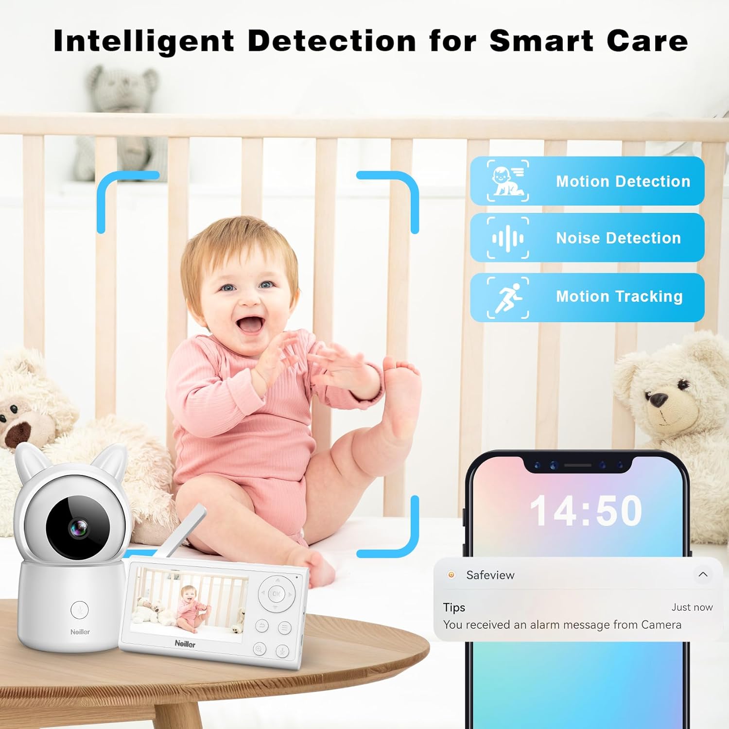 - Upgraded Protection & Caring: to give a great sense of security to parents who have babies, our portable baby monitor adopts multiple thoughtful functions to protect the baby all-day effortlessly and make the baby caring easier, which includes noise & motion detection, motion tracking, temp & humidity detection and feeding reminders, you can know exactly when you are needed. And the split screen feature allows you to install 2 cameras in different rooms to see your baby in all directions.