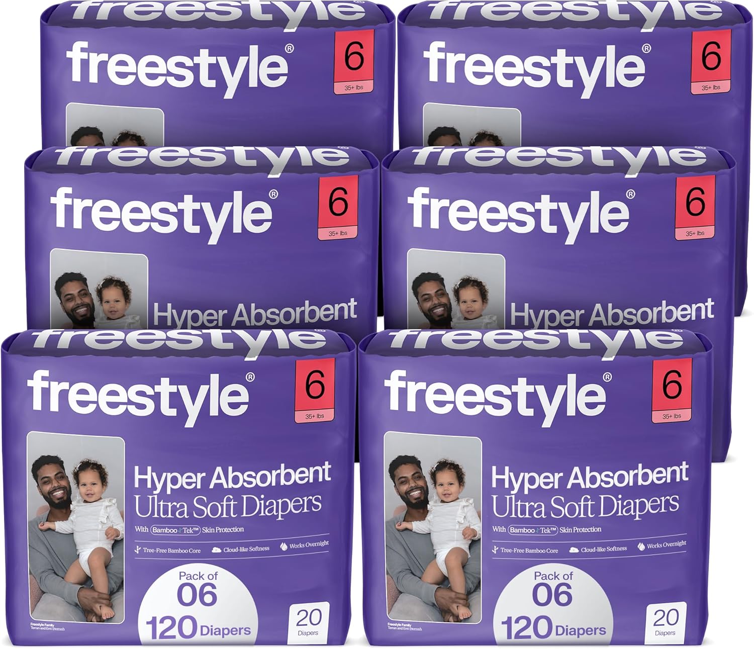 Freestyle BambooTek Diapers – (Size 6) Hyper Absorbent & Non-Toxic – Disposable Diapers for Sensitive Skin – Ultra Soft Diapers (35+ lbs) – 120 Count