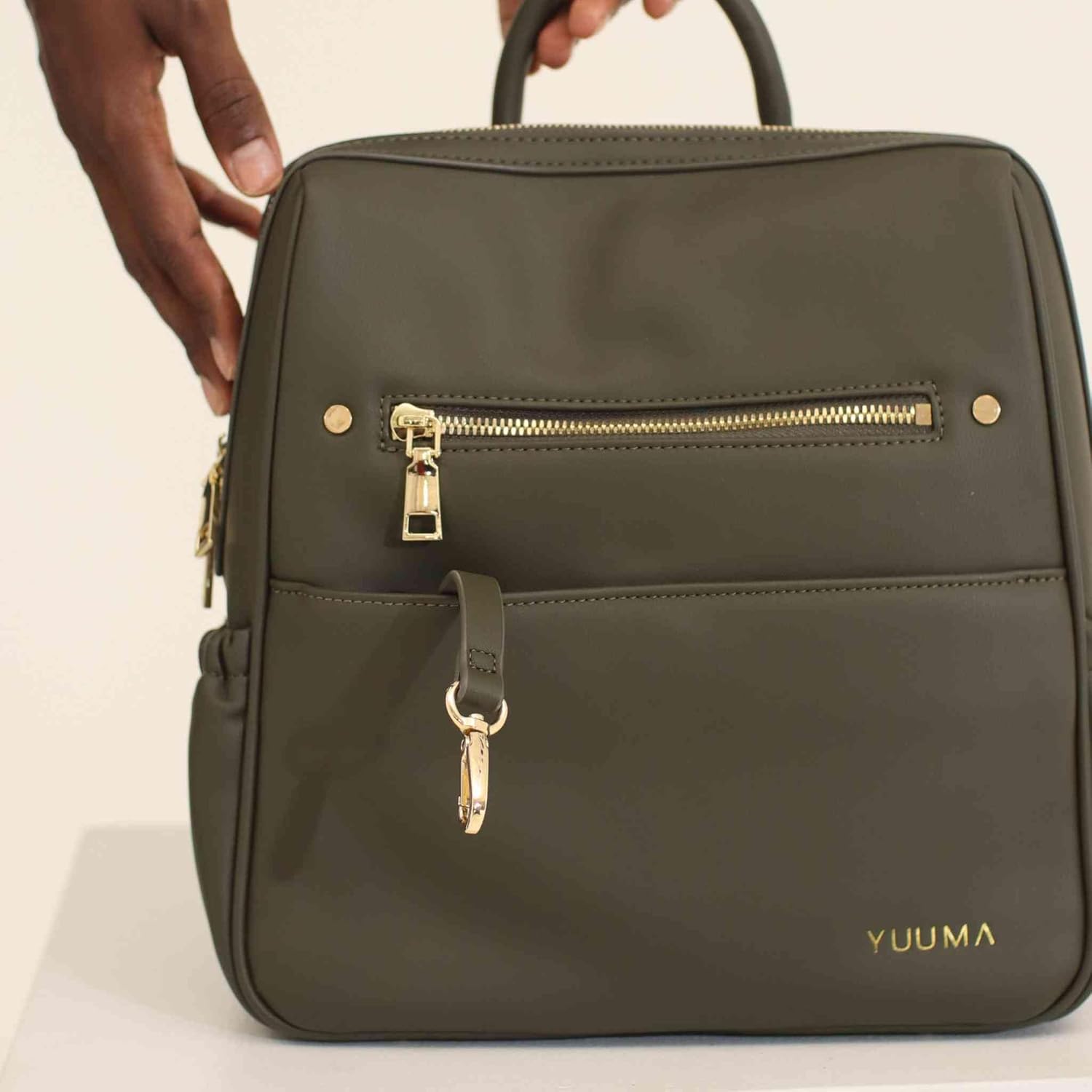 YUUMA Mini Diaper Bag Backpack-Minimalist bag With Premium Vegan Leather Material With 7 Interior and 5 External Pockets (Olive)