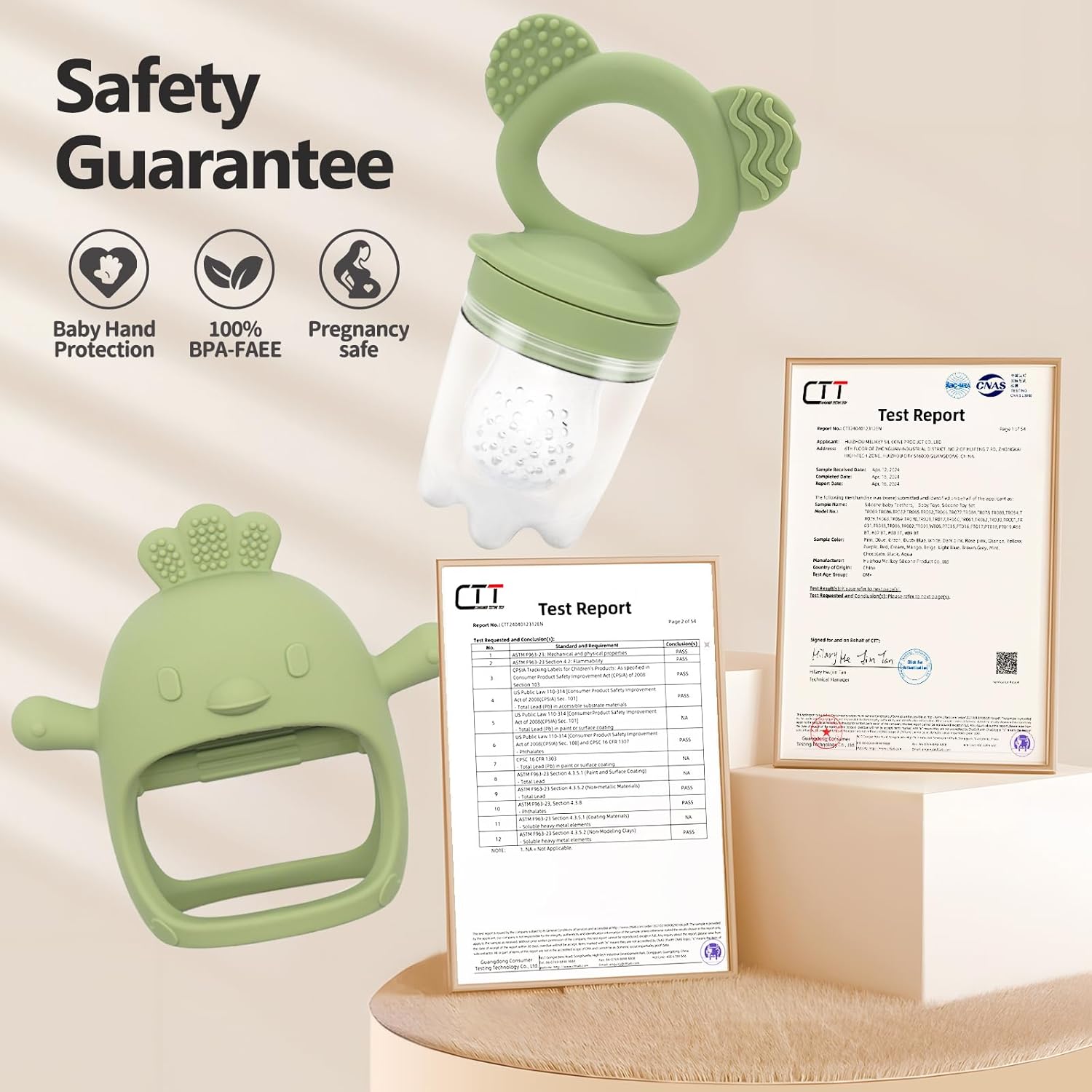 - Baby Teething Toys: Our foof feeder comes with a silicone teething mitten as well. This the perfect solution for babies who aren't yet able to hold onto teethers. The soft silicone mitten fits over little hands, and the inner bar provides extra grip support for babies to grasp.
