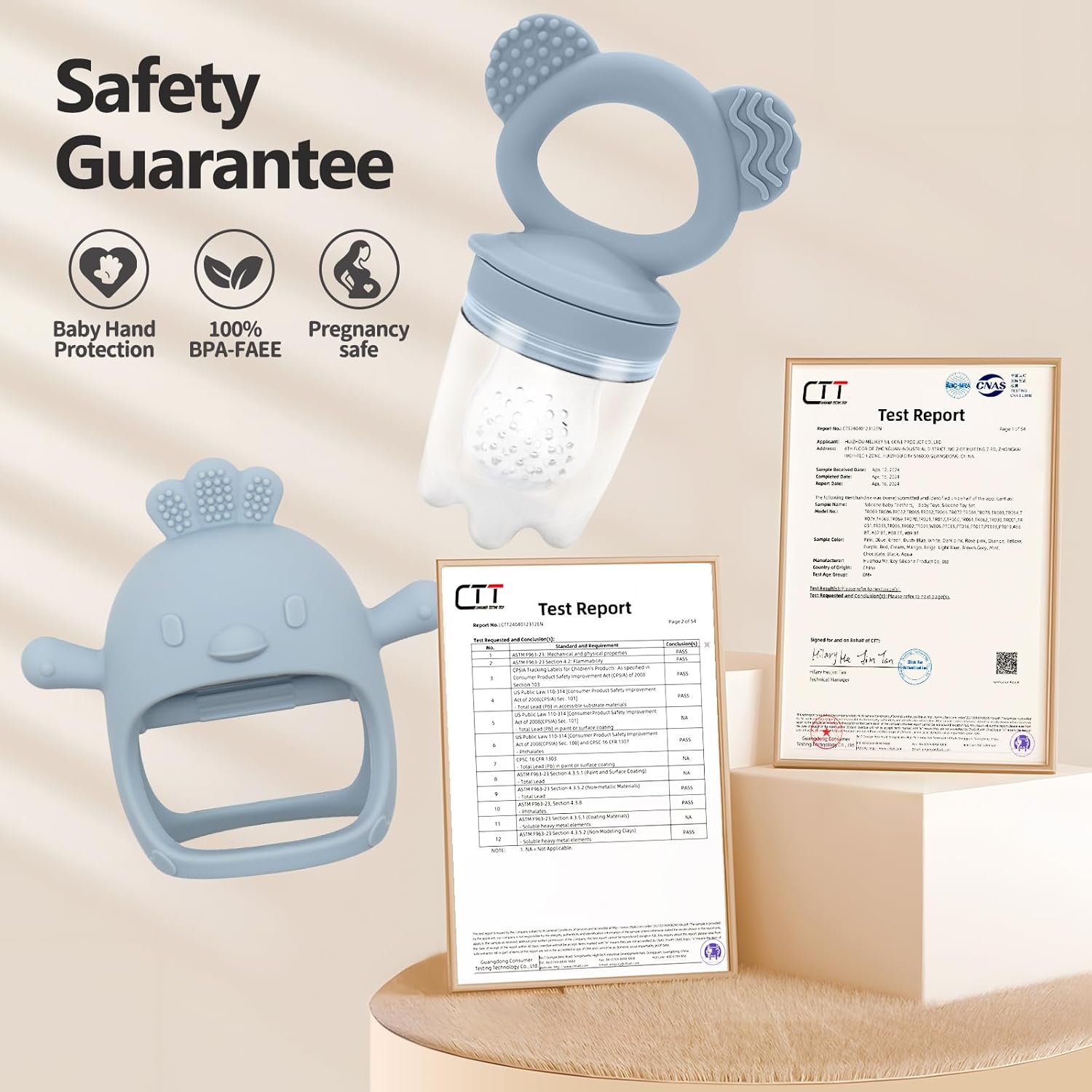 - Baby Teething Toys: Our foof feeder comes with a silicone teething mitten as well. This the perfect solution for babies who aren't yet able to hold onto teethers. The soft silicone mitten fits over little hands, and the inner bar provides extra grip support for babies to grasp.