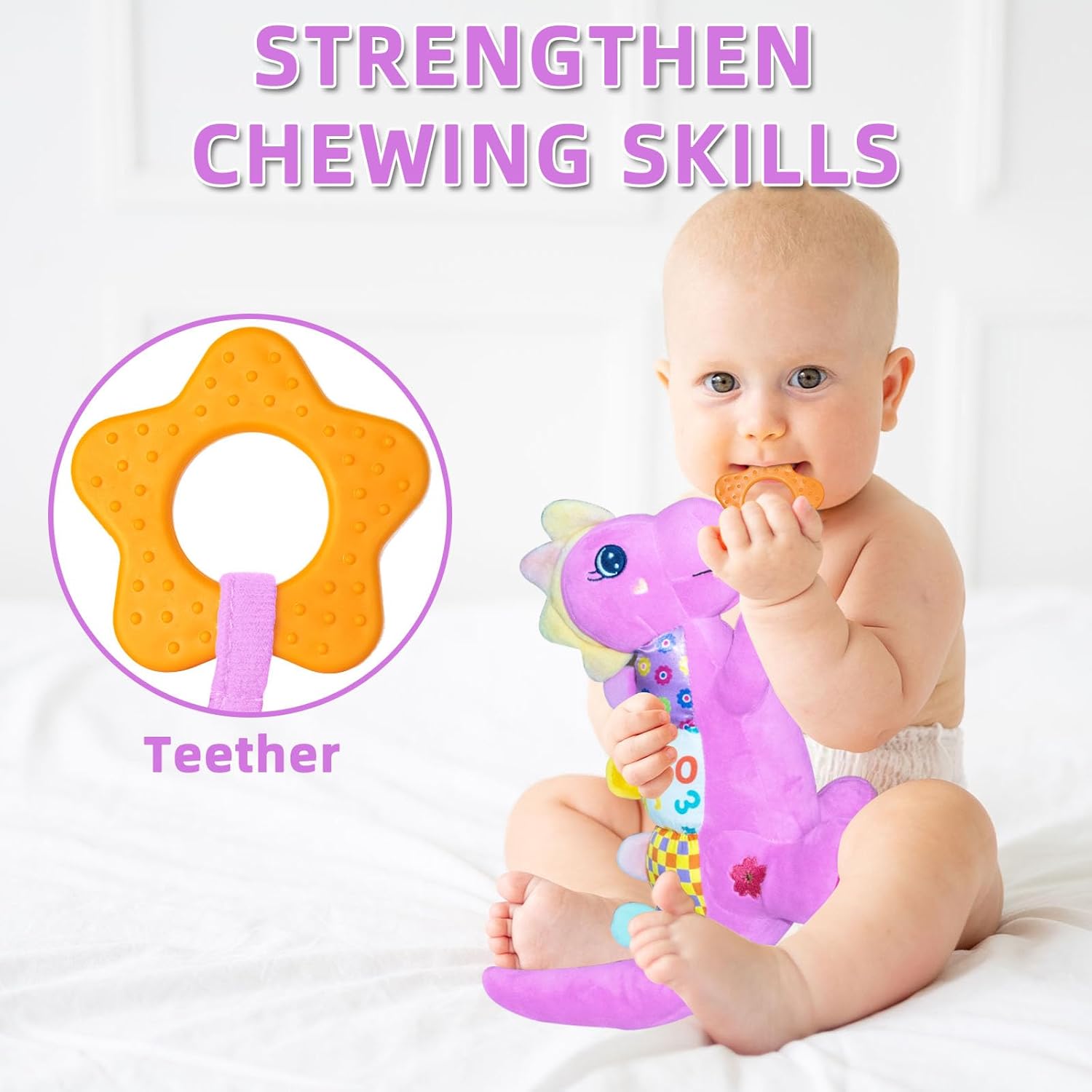 - SAFE & FRIENDLY NEWBORN TOY: The dinosaur baby girl toy is made of high-quality plush, safe, BPA-free, odor-free, and has no moving parts. It is made of soft fabric that babies aged 0-6 months like. It uses high-quality pp elastic cotton. It feels comfortable and elastic when holding. The teether on the chest can be safely let the baby chew gently to relieve the discomfort of teething.