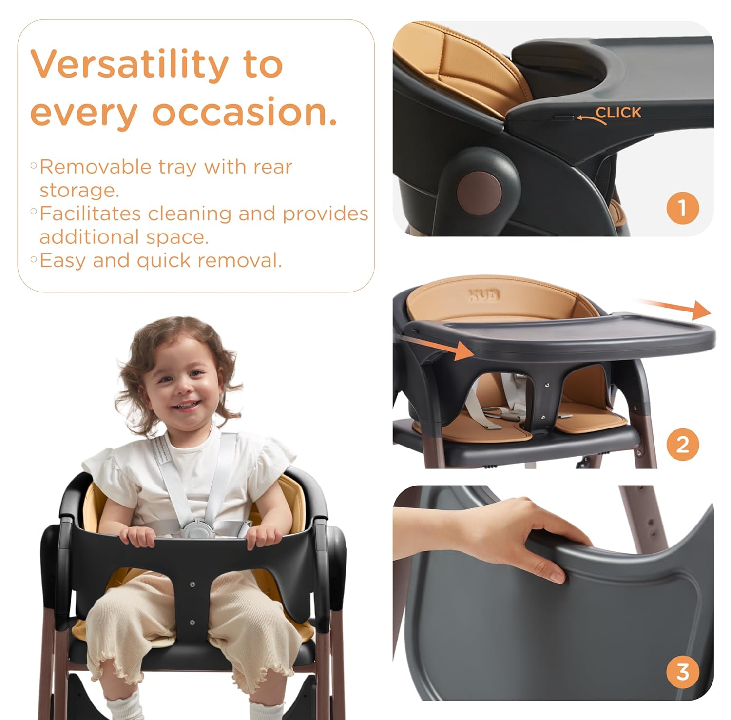 KUB High Chair for Babies and Toddlers Adjustable Foldable Convertible 5 Point Harness Easy Clean Wood-Printed Metal with Removable Tray Baby Highchair for Family (Black&Walnut Wood-Printed Metal)